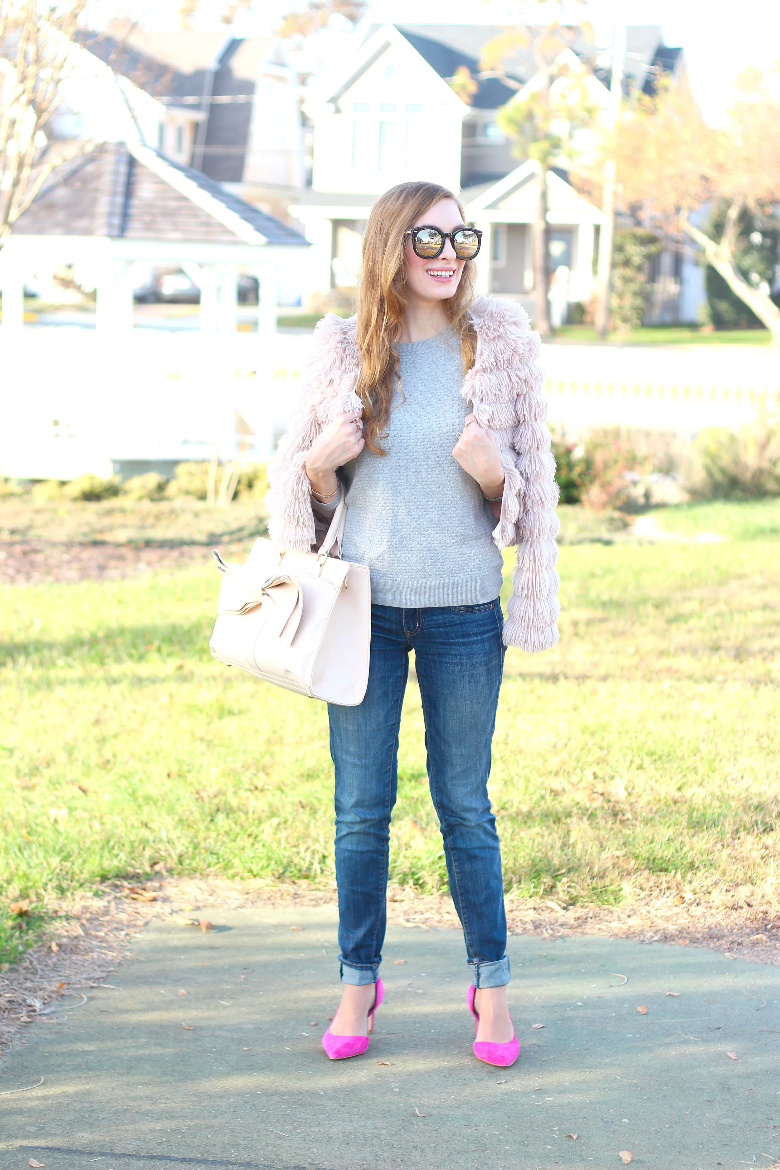 Similar Pink Fluffy Jacket <-- Under $27! || Similar Gray Sweater <-- Embellished and gret for the holidays under $50 || Skinny Jeans || Pink Heels || Karen Walker Sunnies via Shopditto c/o || Similar Bag ||