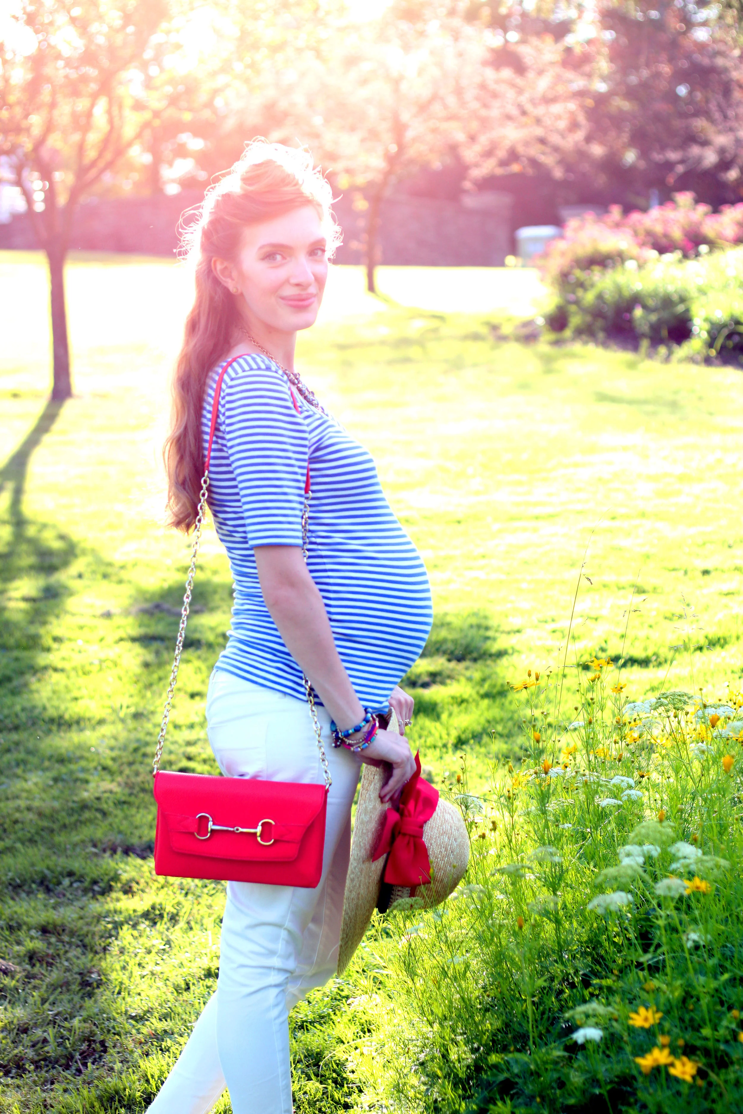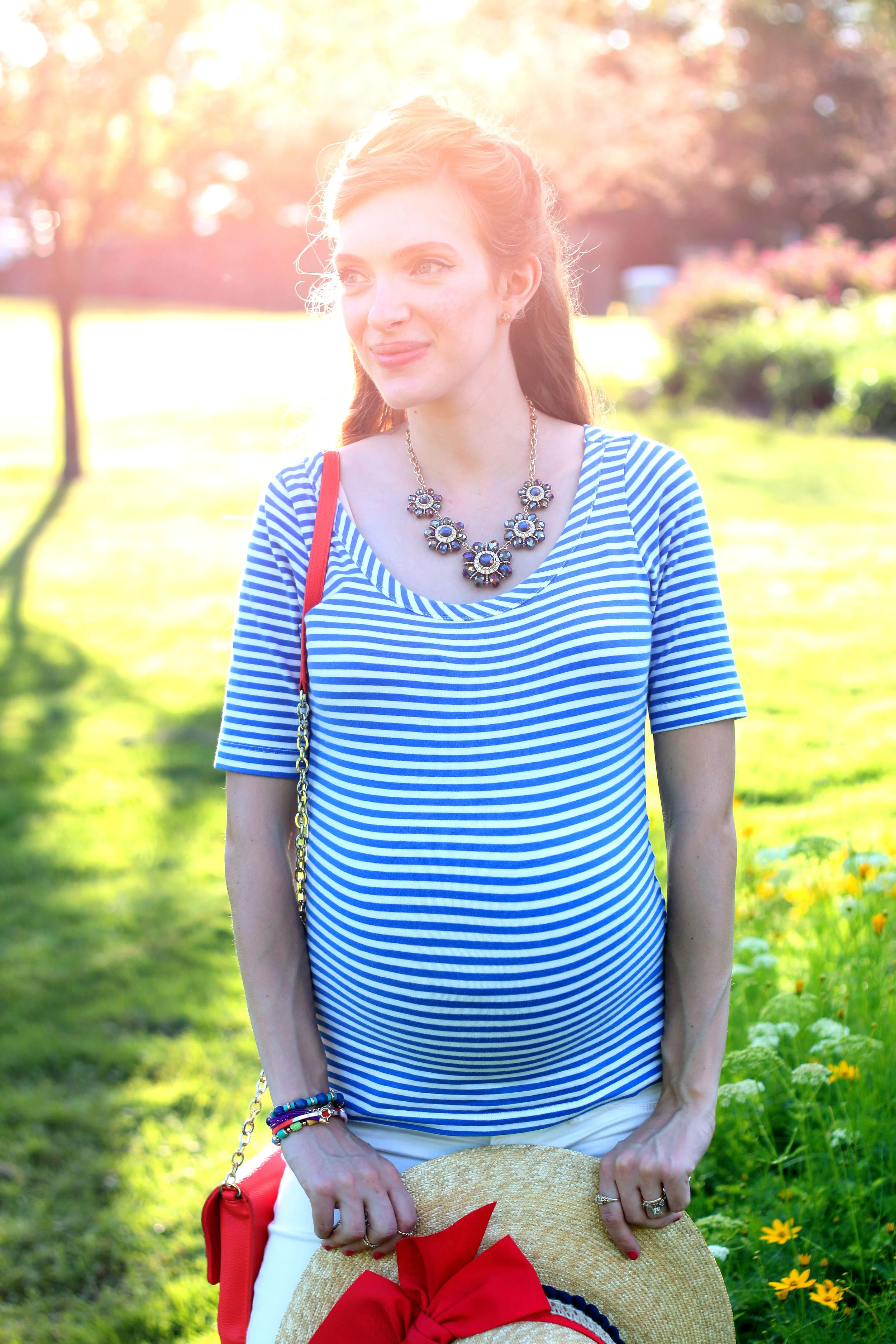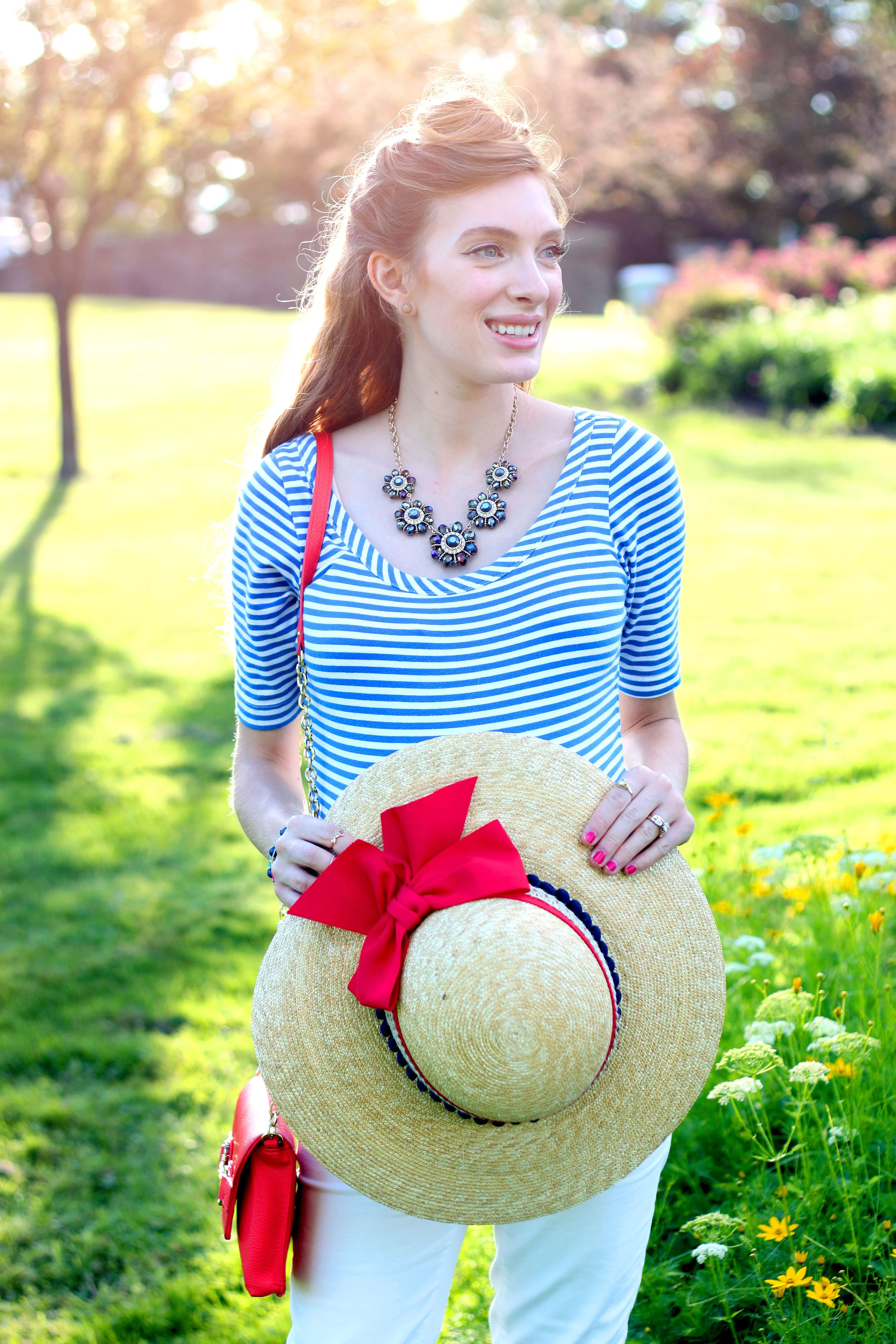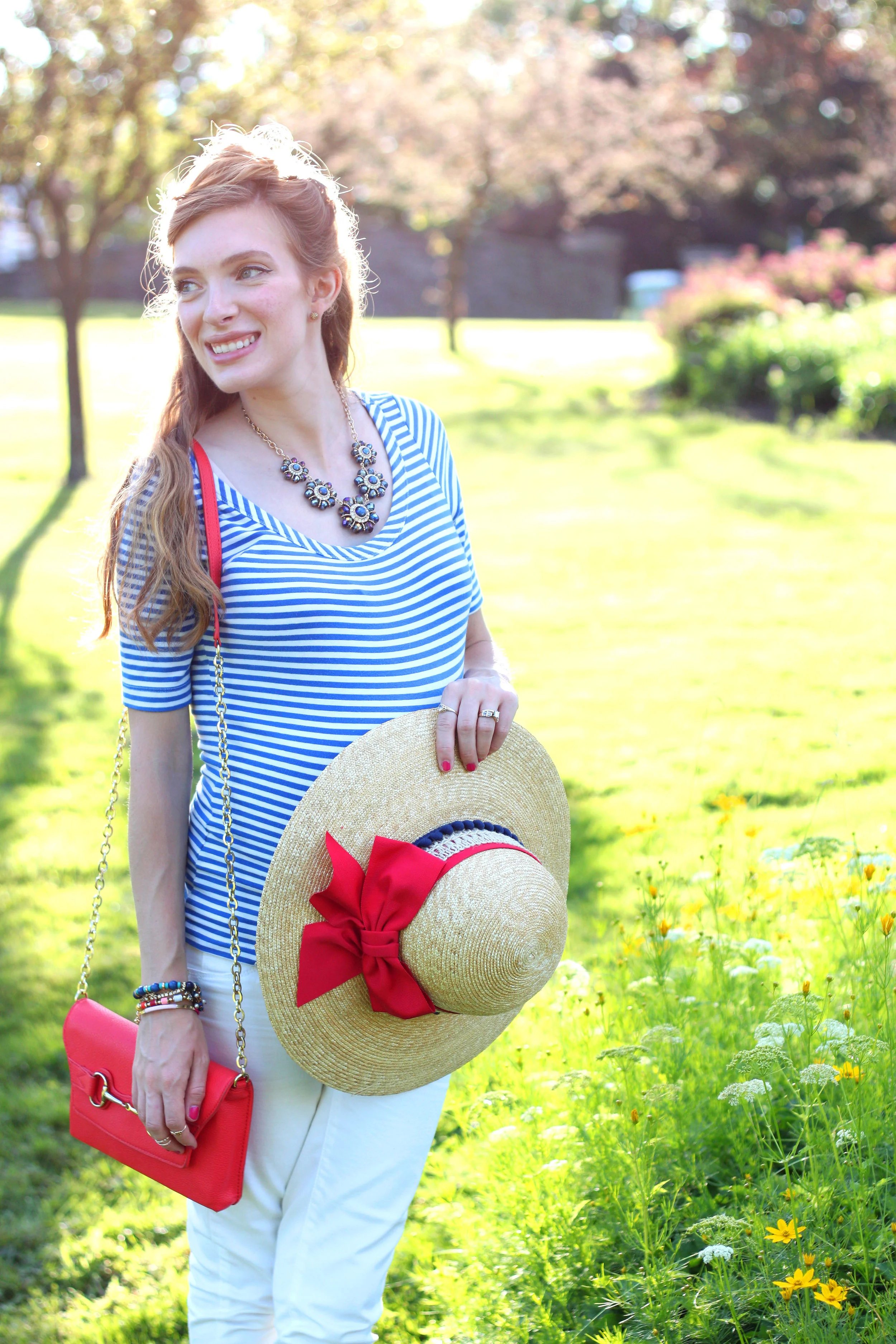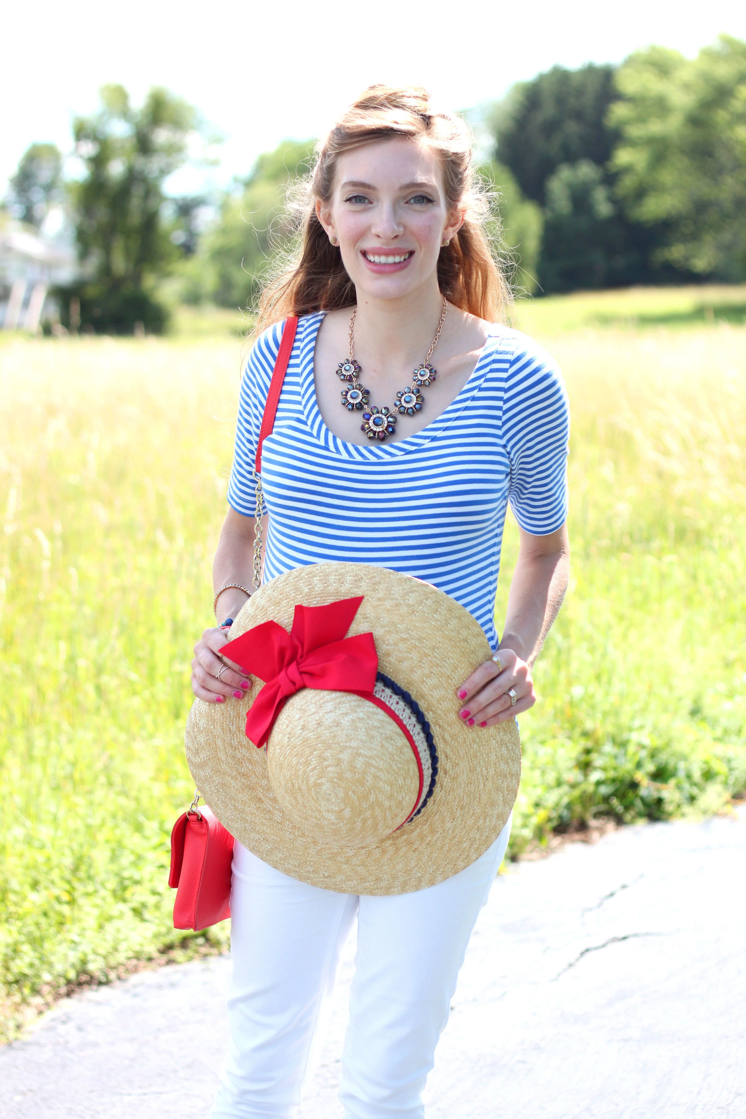 Today I'm featuring an online boutique called The Shopping Bag. They have items that are carefully curated into collections and handpicked to offer a unique selection of clothing, accessories, home decor, beauty products, and much more. With thousands of products at every price point and always adding new arrivals every week, The Shopping Bag is the perfect retail therapy for any demographic and for every budget! The necklace I'm wearing, which is perfect for any nautical or summer time look, has iridescent blue rhinestones that sparkle and really catch the eye. This necklace instantly came to mind when I was thinking of another 4th of July look to create. The blue and white stripes, white skinnies, neutral wedges, and pops of red from my bag and hat all blend together beautifully to make a fun summer outfit.