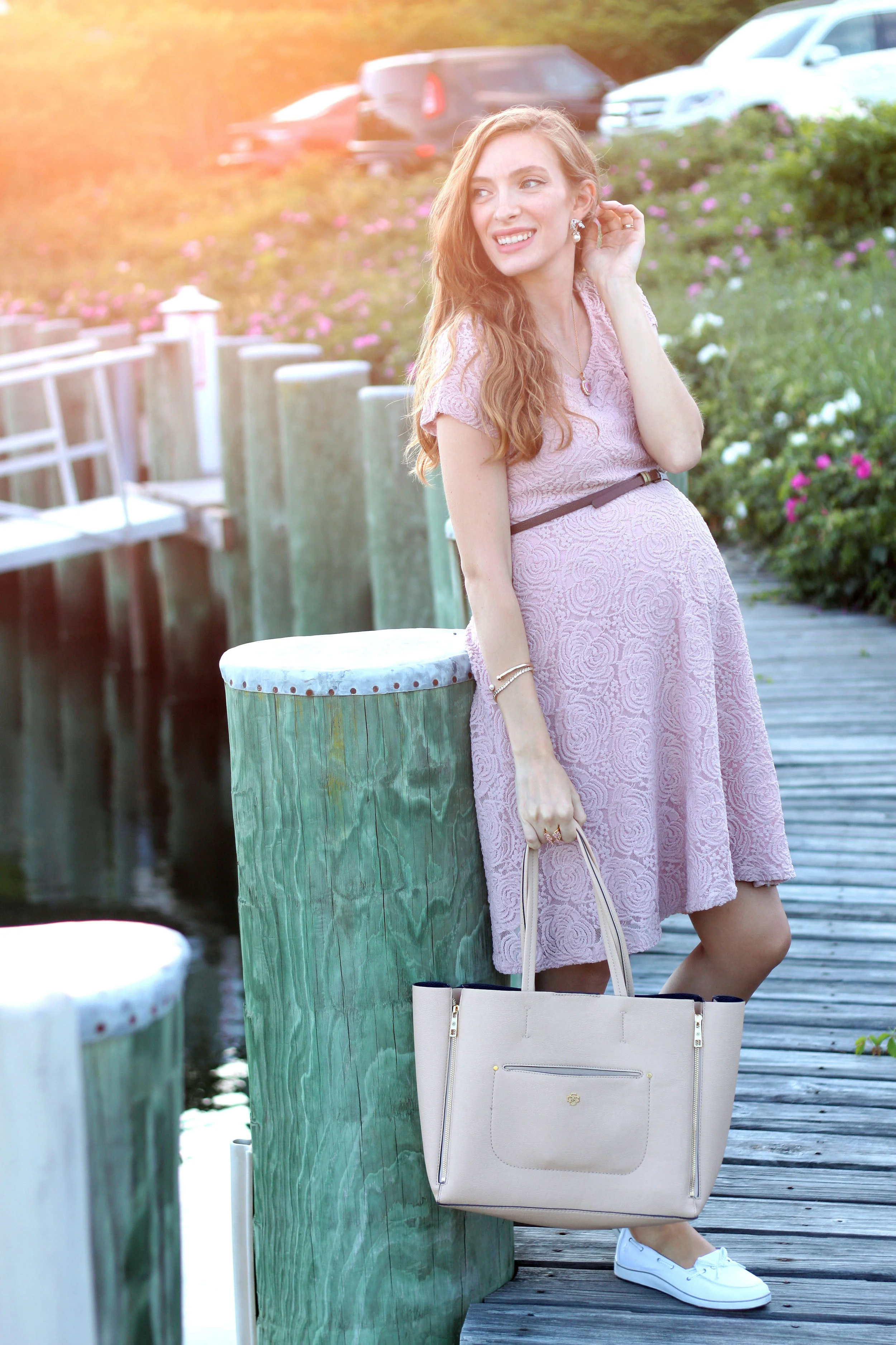 Last weekend I took a small trip to Cape Cod with my dad and had the most wonderful time. I knew it was going to be a long car ride (6 hours, actually turned into 8 with traffic) so I wanted to wear something that would be comfortable, but still stylish. Enter this cute maternity dress from PinkBlush Maternity. To be truthful, I do not own very many maternity clothes, but as I'm getting further along in my pregnancy (36 weeks currently) a few of them are absolutely necessary! After the long 8 hour drive in this dress, I felt wonderful and was able to photograph these photos right as we got there for sunset. Afterwards my dad and I headed into town for some dinner. This looks transitioned beautifully from a comfy car ride into a chic walk downtown for some yummy food. As always, when I'm traveling flats are a must and paired for a cute look with this pink lace dress.