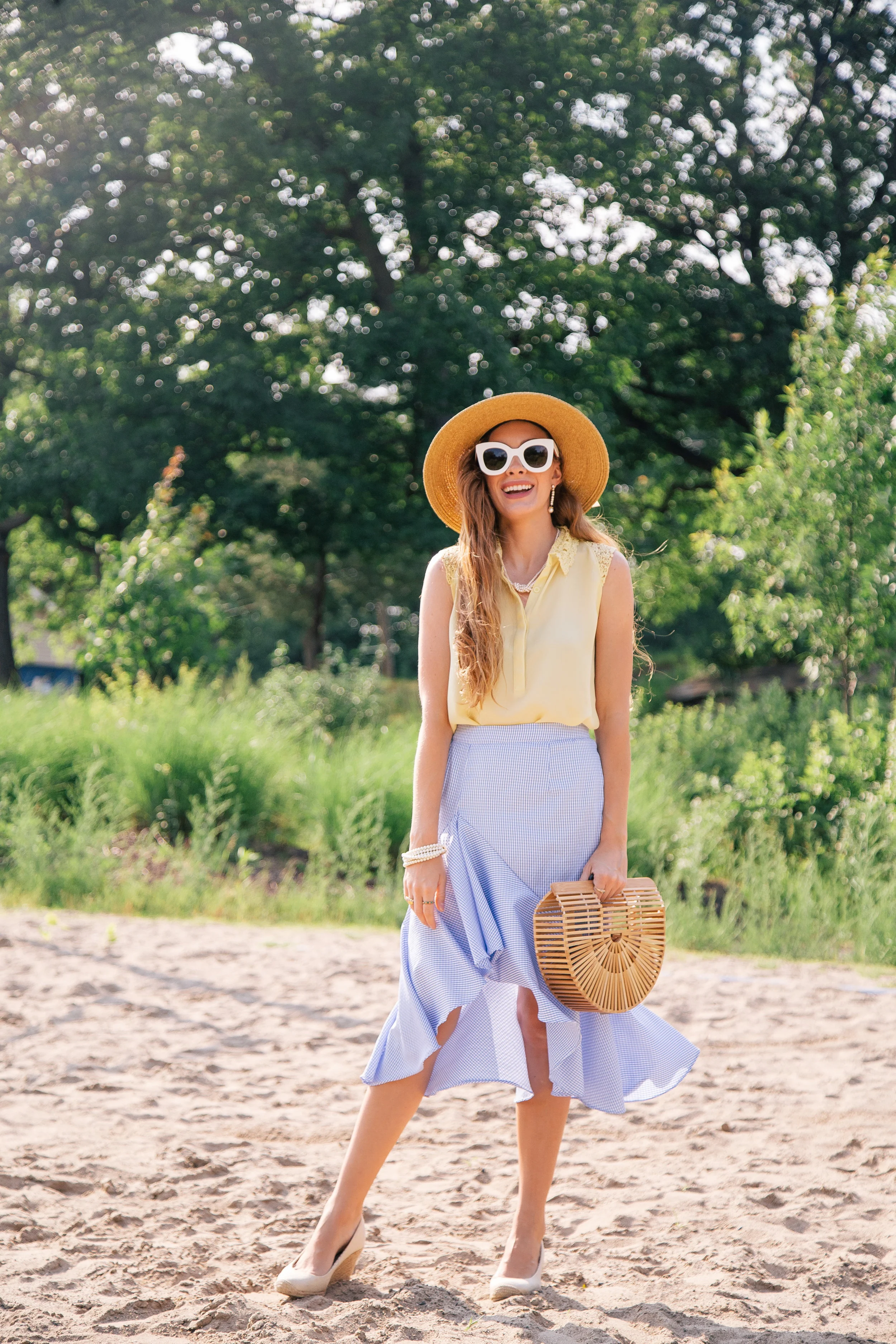Good morning and welcome to the new week! Lately, I’ve been loving a blue and yellow combo for summer. This outfit in particular, it feels so light and airy with a touch of casual elegance. It also reminds me of Cape Cod. The skirt has a beautiful ruffle dip hem with a light gingham pattern throughout. It fits true to size and the material feels wonderful on.