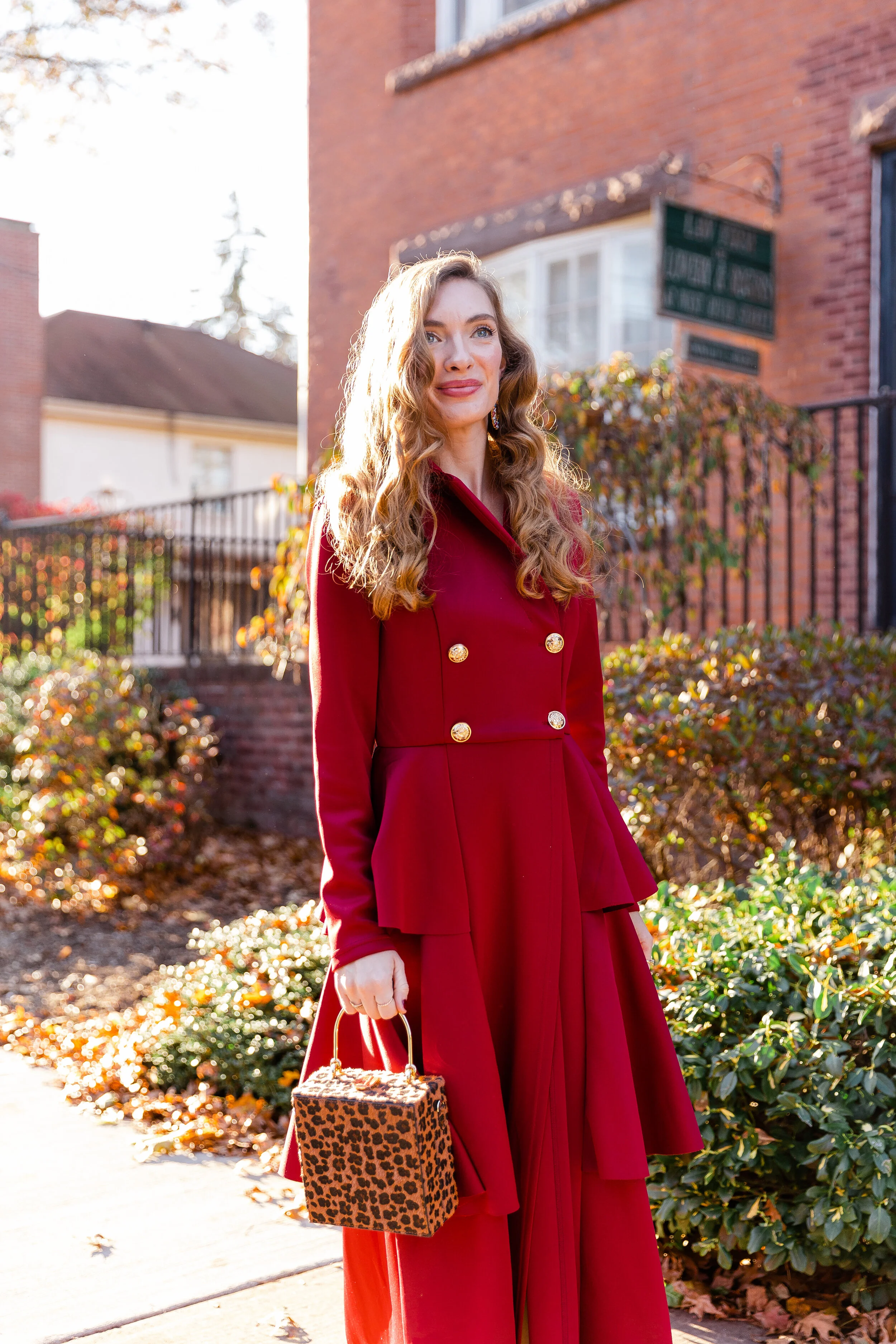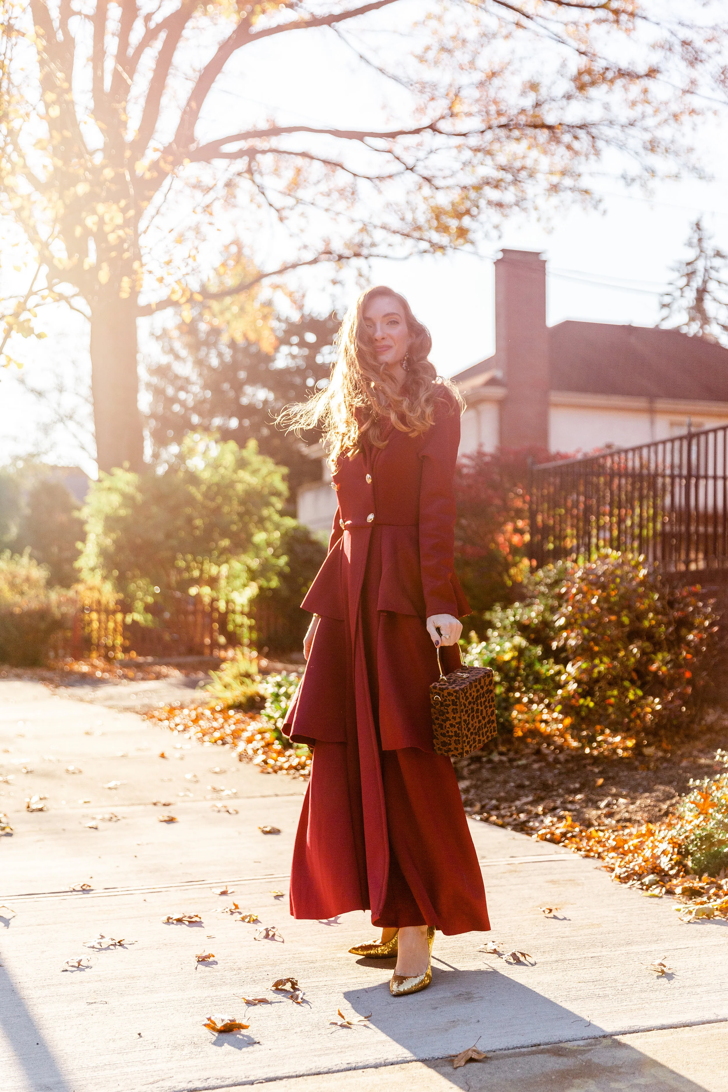 Talk about a statement dress! The gold buttons pop beautifully against the rich burgundy background, which I adore for the fall and winter seasons. It’s one color I always have on repeat and love pairing with gold, blush, forest green, and mustard. The blazer style lends a nod to ever popular menswear while the ruffles and side slit are uniquely feminine and may I say, a nice little surprise. What I adore about this dress are the two styles pairing perfectly together to form a standout piece. At first, I was concerned that the dress may swallow my 5’2 frame, but this was not the case. While wearing an XS, the dress fit comfortably without weighing me down and with heels on, had the perfect length. With colder weather on the horizon, this blazer dress is sure to keep you fashionably warm!