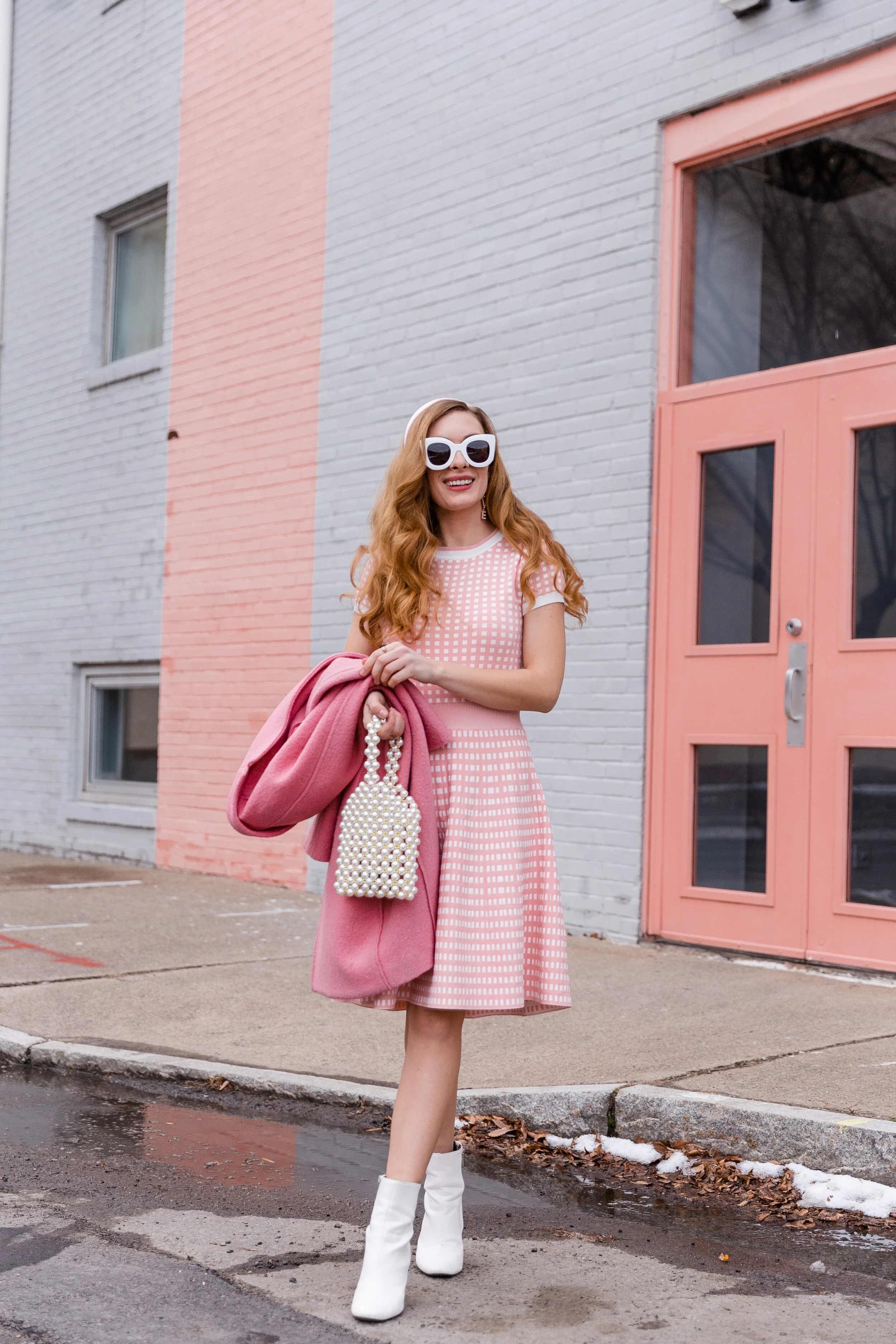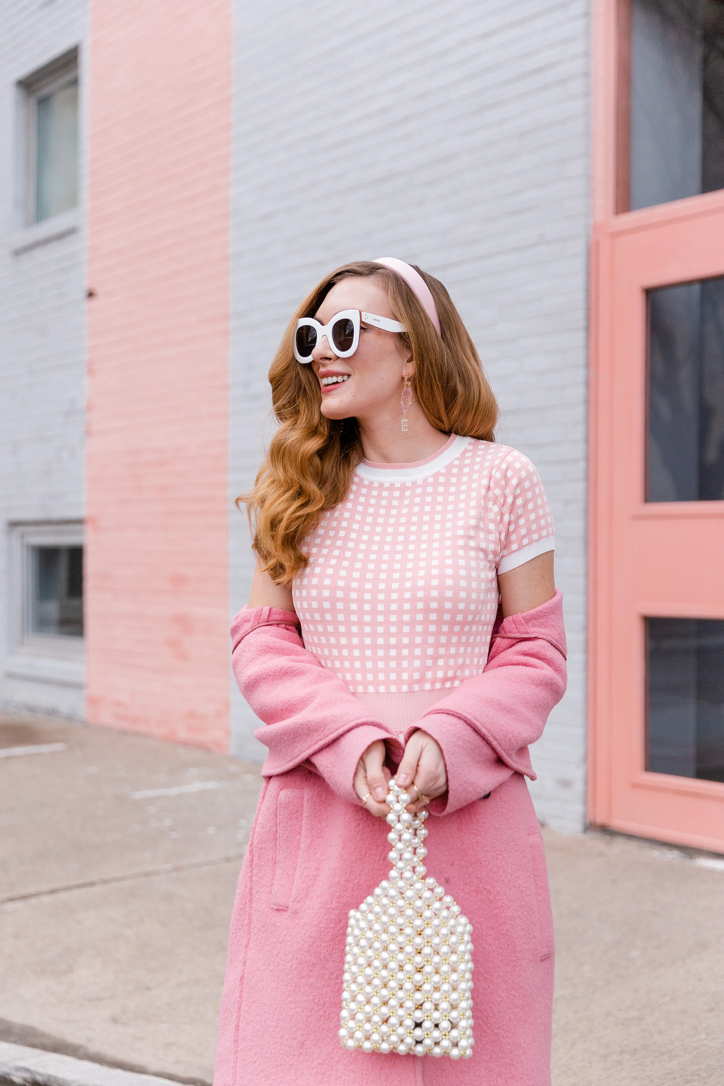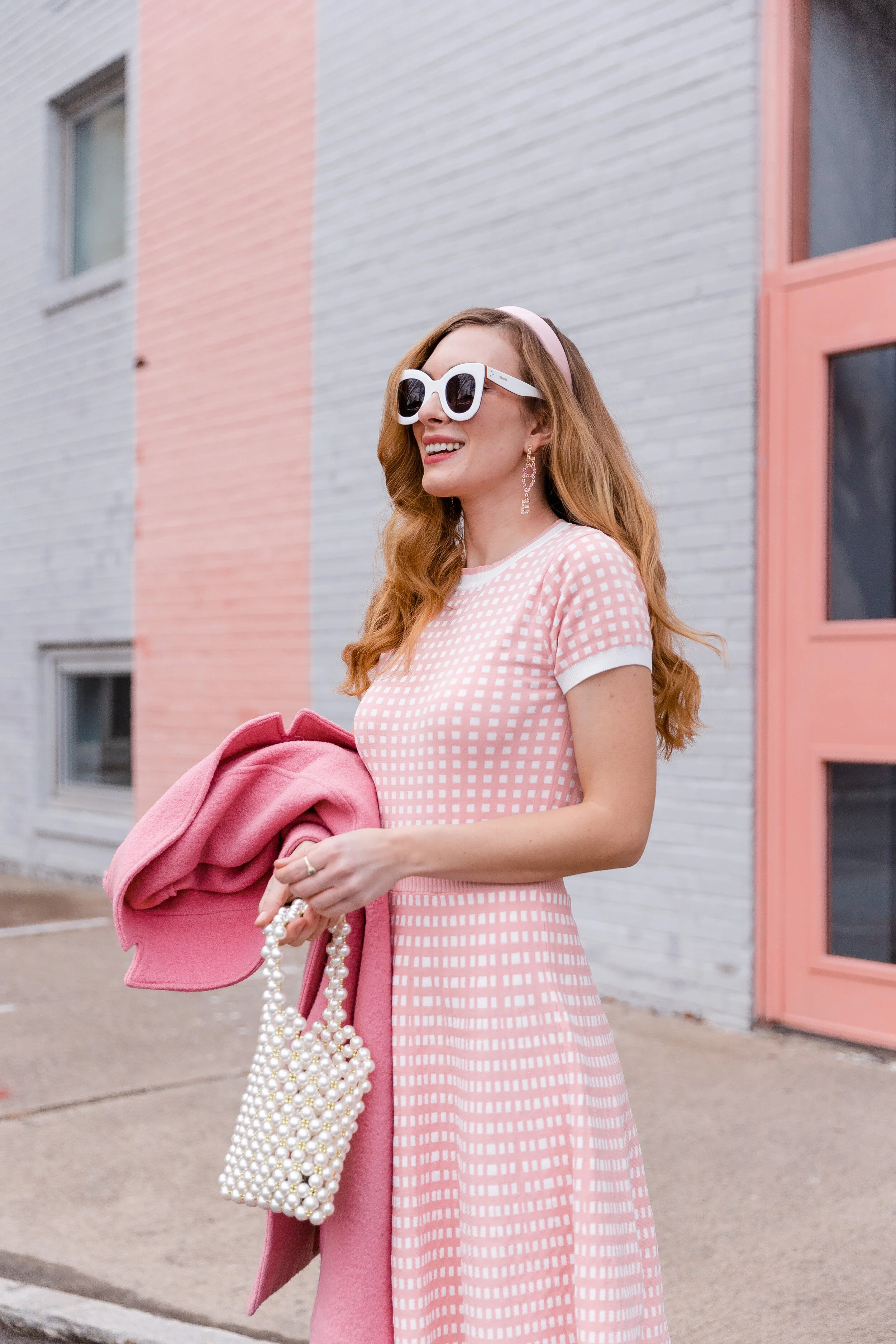 Pink Gingham Dress (Similar) || Similar Sunglasses || Pearl Bag || Love Earrings || White Boots (Old, Similar) || Pink Coat (Old, Similar) || Pink Satin Headband ||