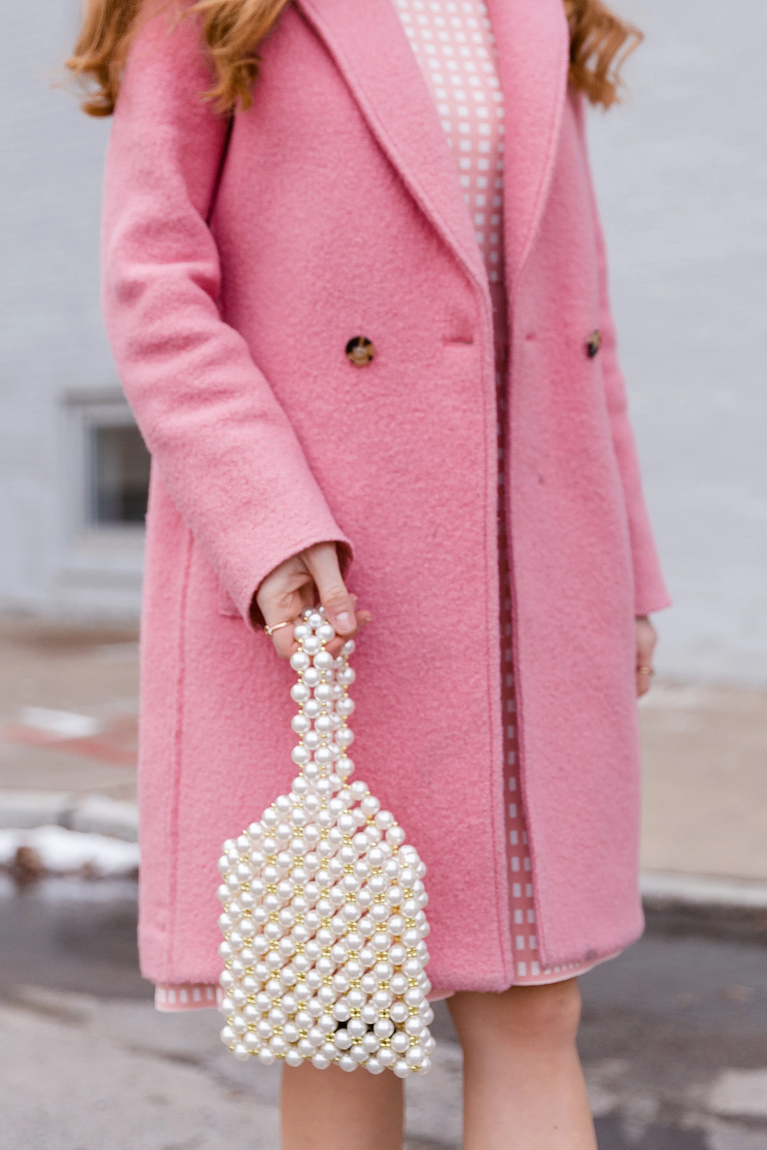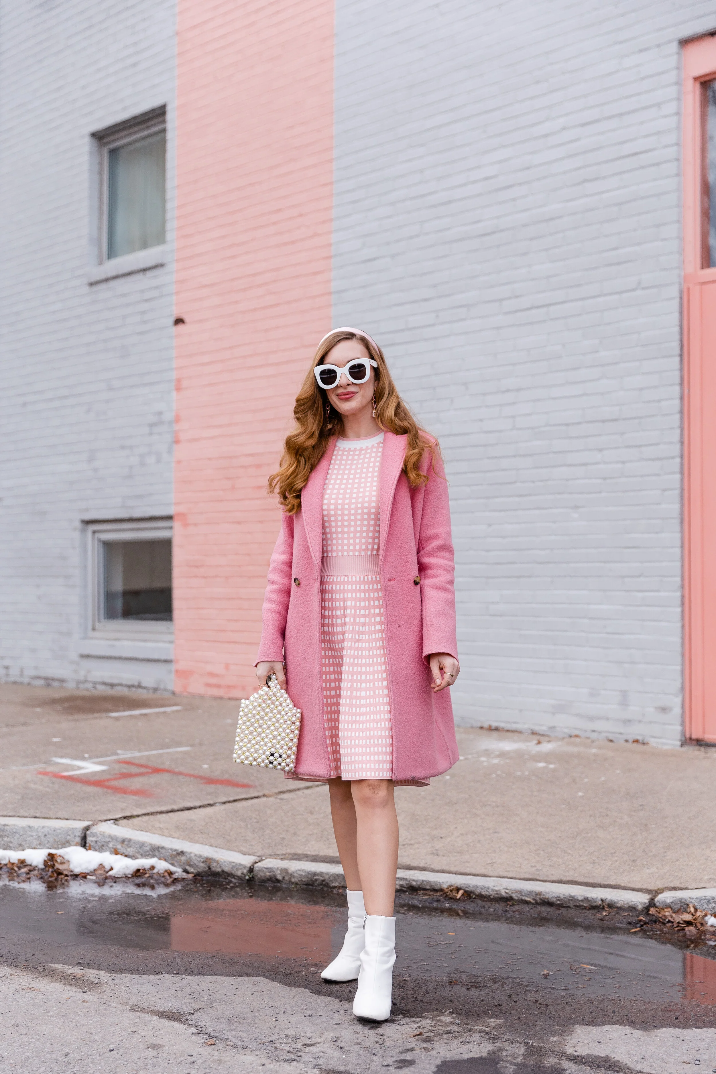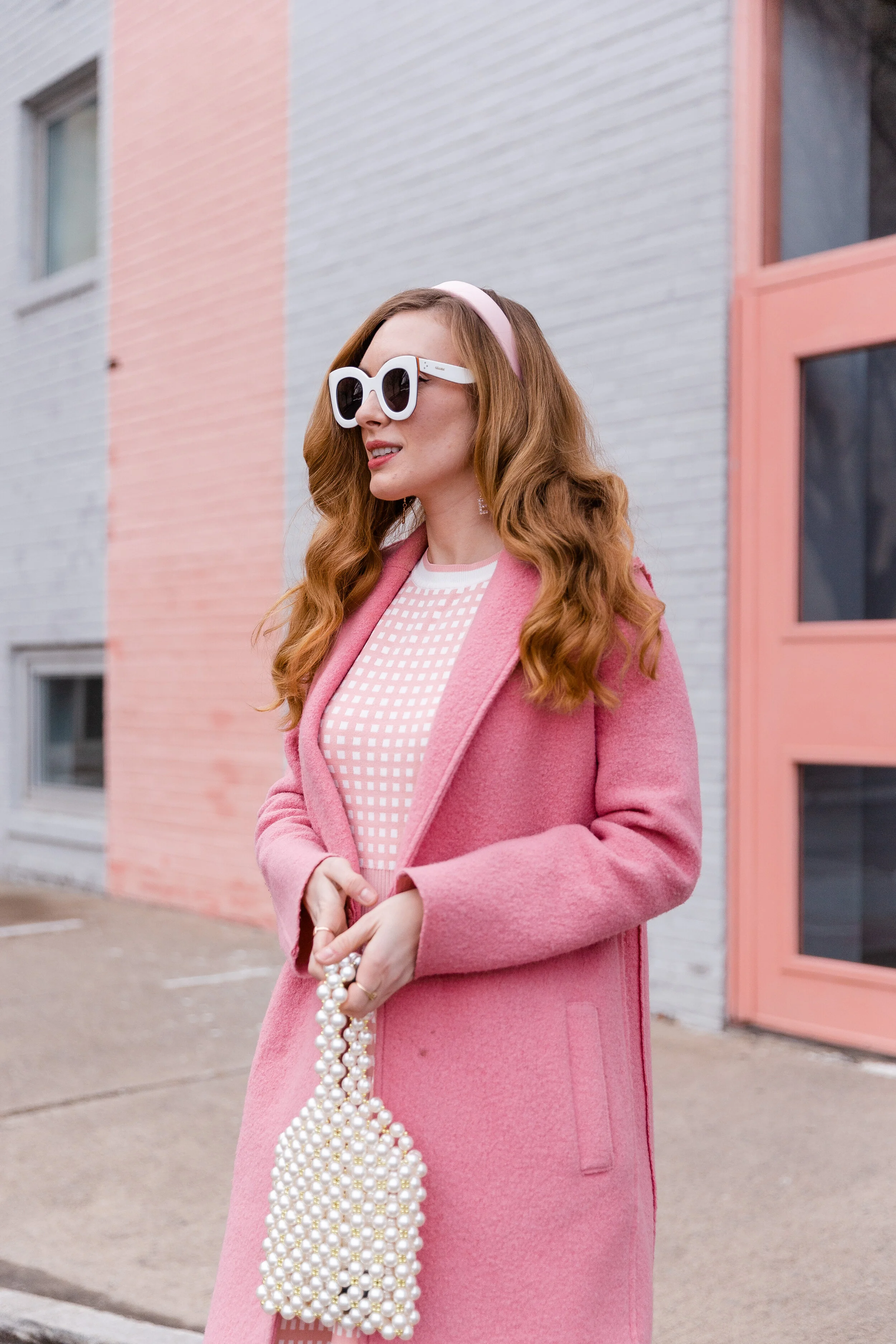 Pink Gingham Dress (Similar) || Similar Sunglasses || Pearl Bag || Love Earrings || White Boots (Old, Similar) || Pink Coat (Old, Similar) || Pink Satin Headband ||