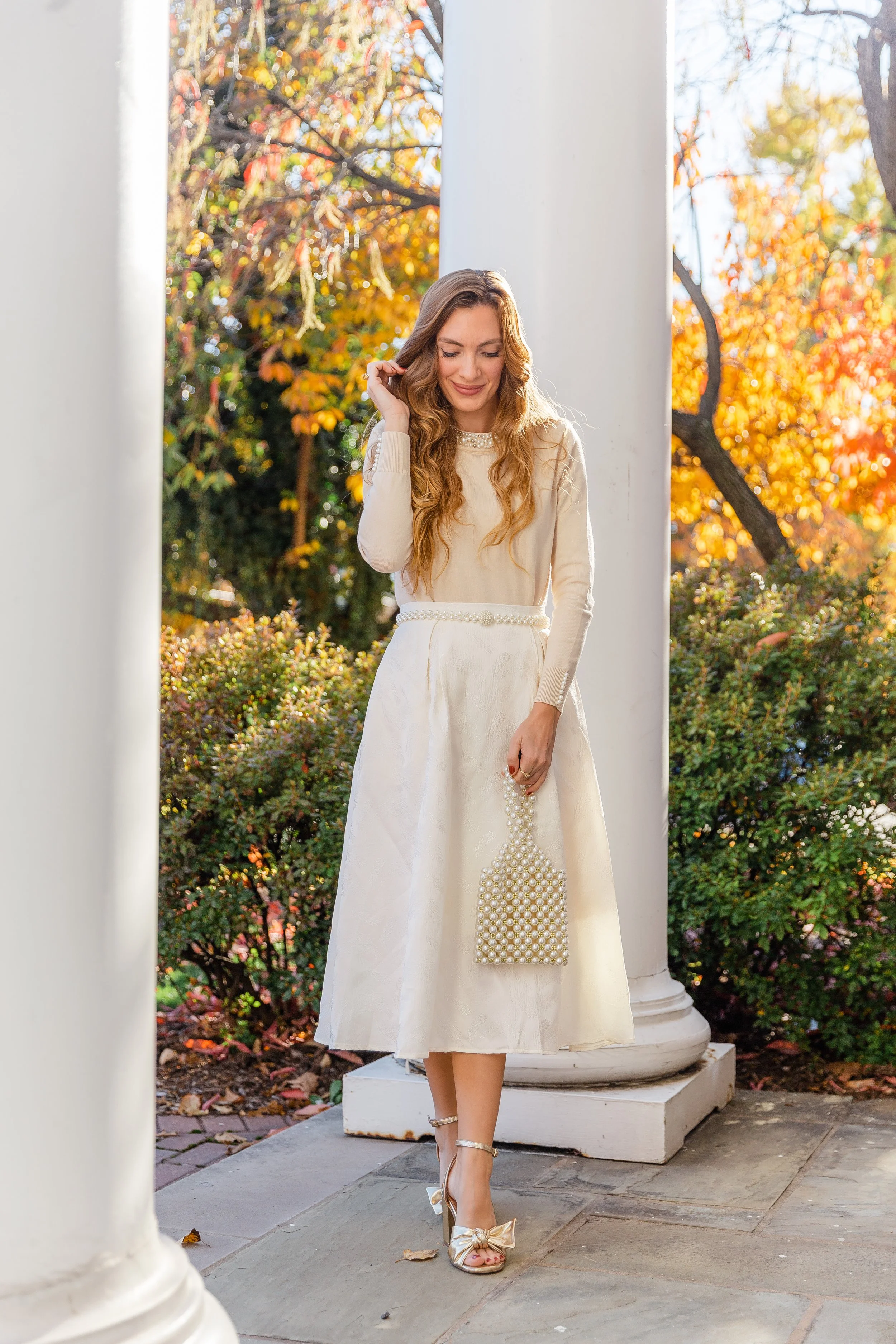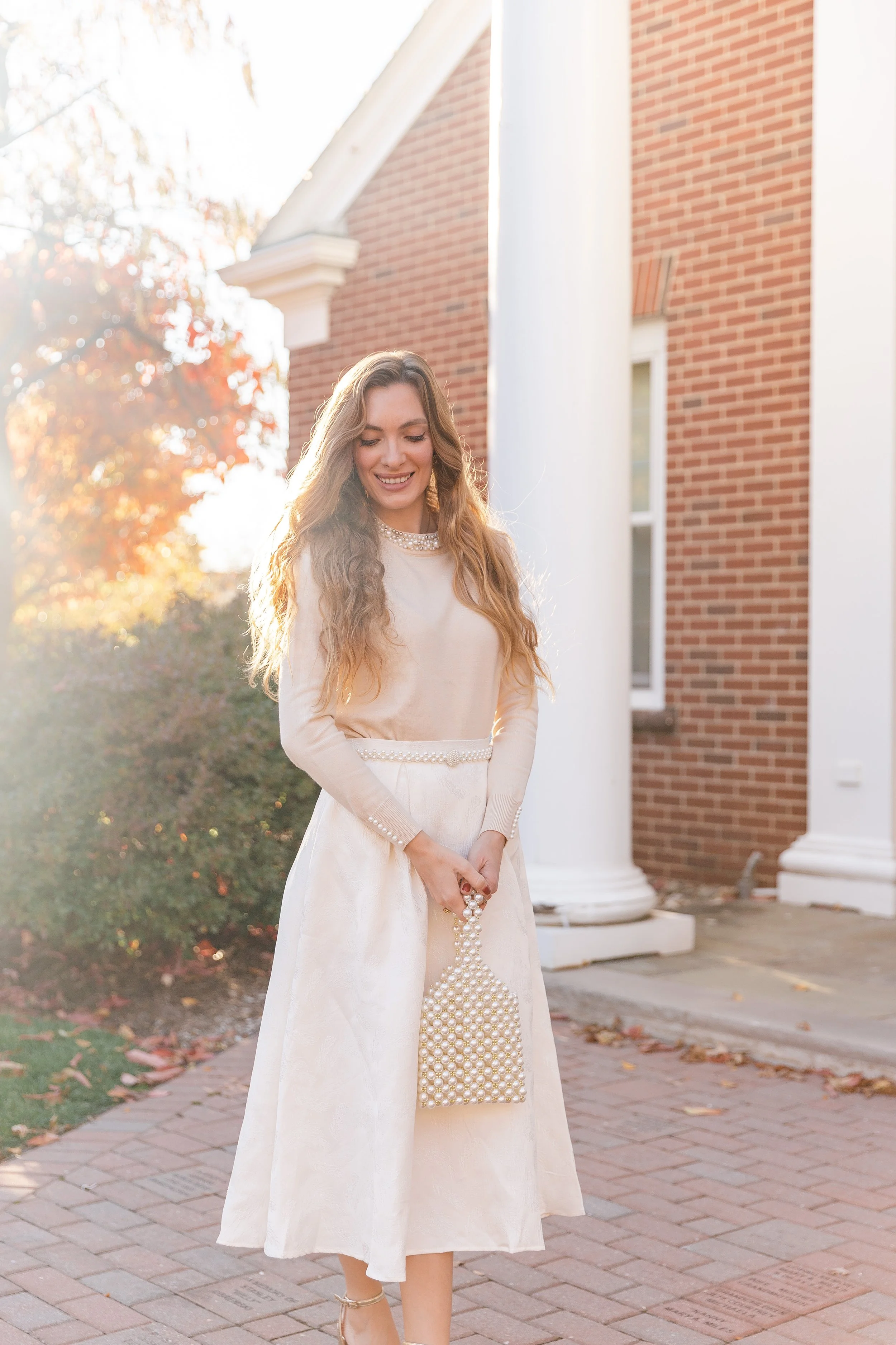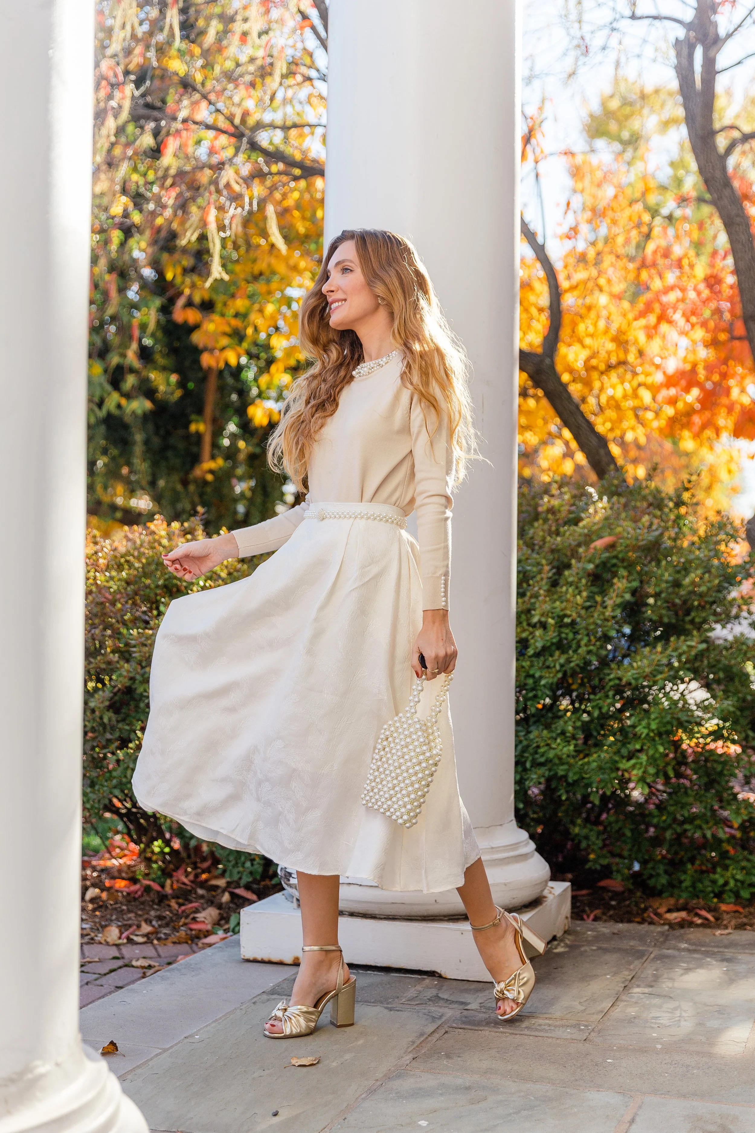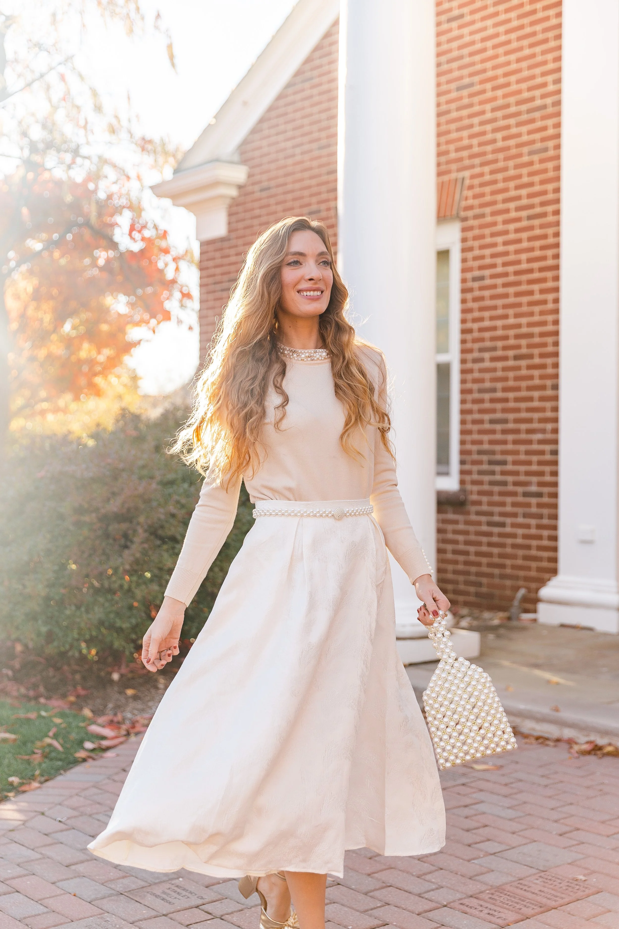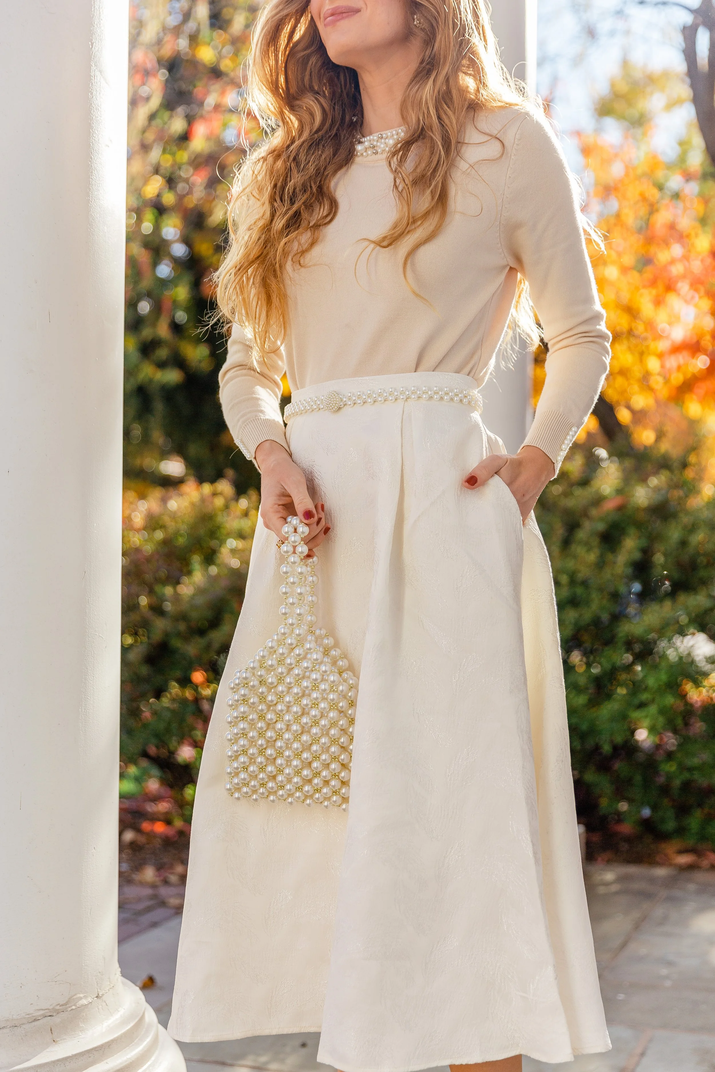 Welcome to November, friends! Today’s look is all about charming ladylike details in the most gorgeous creamy neutrals that are just perfect for the holiday season. This whole ensemble makes my heart swoon with happiness. As you know, I’m a vintage fan at heart and I adore anything that adds that little bit of glamour and polish to outfits. This creamy sweater from Chicwish feels so soft and warm and also has the most beautiful pearl trimmed collar with pearl trimmings also at the cuffs. Wearing this sweater with a pair of jeans and over the knee boots would be a fun way to add some polished flair to an everyday look! I choose to pair the embellished sweater with a jacquard reed print skirt for a more romantic feel. The skirt, also from Chicwish, comes in a gorgeous shade of ivory, has a stretchy pearl belt and pockets! Side note, I’m in love with the pearl belt! How fantastic to be able to wear it with other outfits. A true winner if I do say so myself. Both pieces, worn together or separate, create a timeless ensemble with lovely details.
