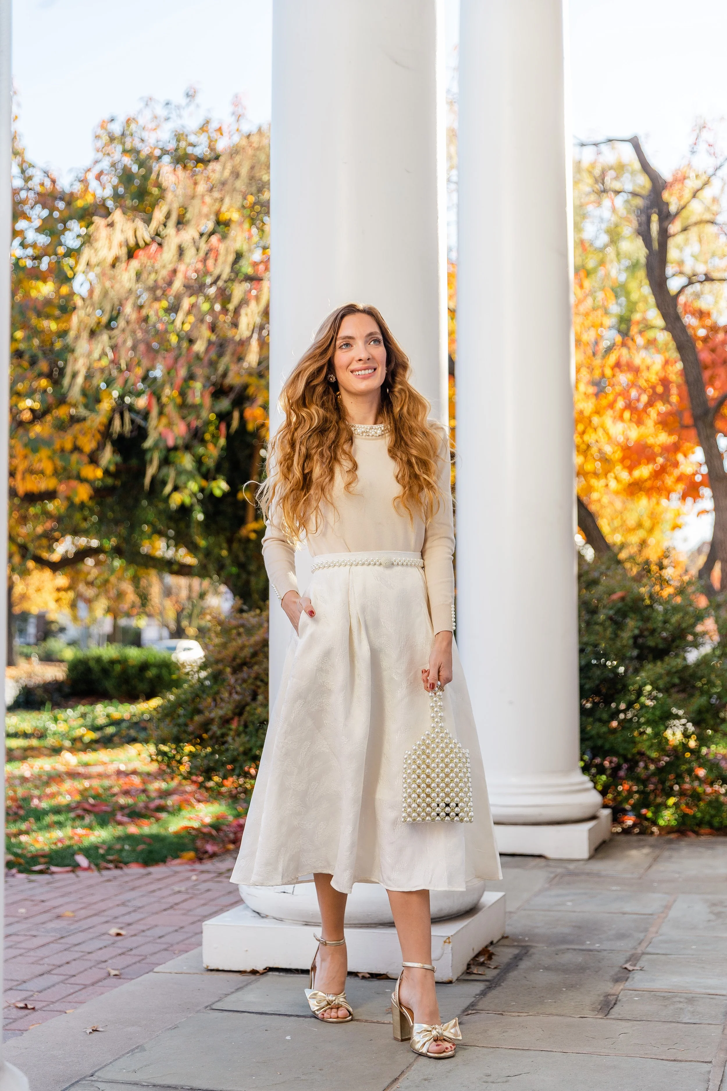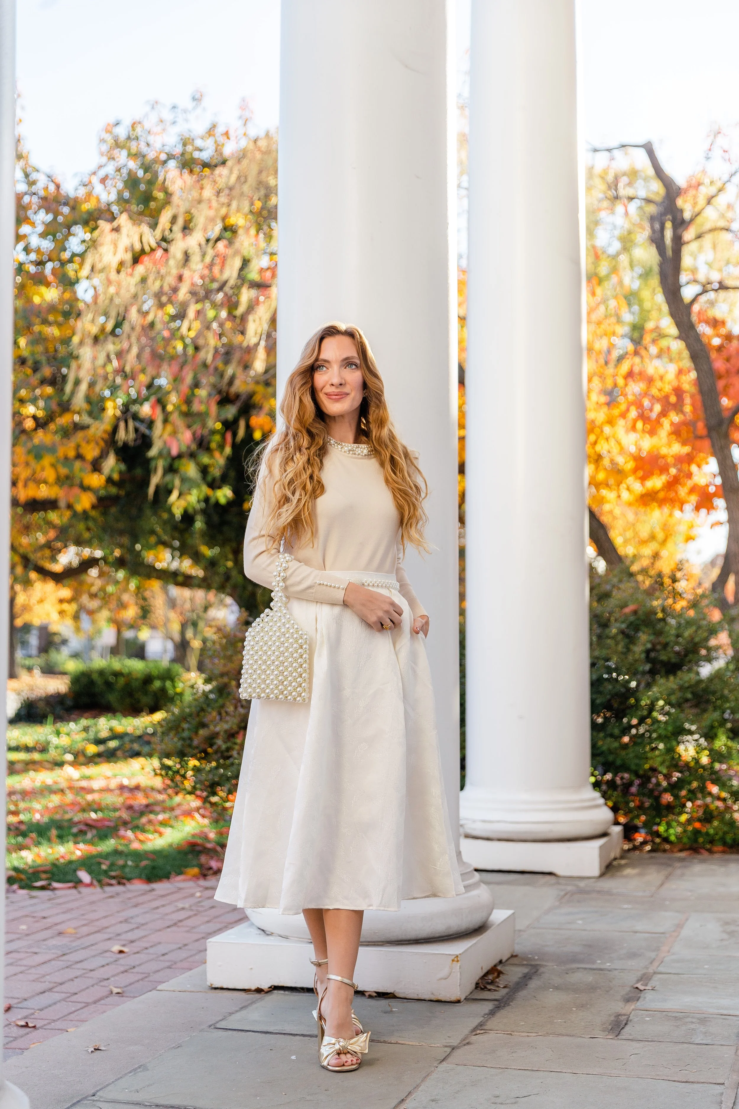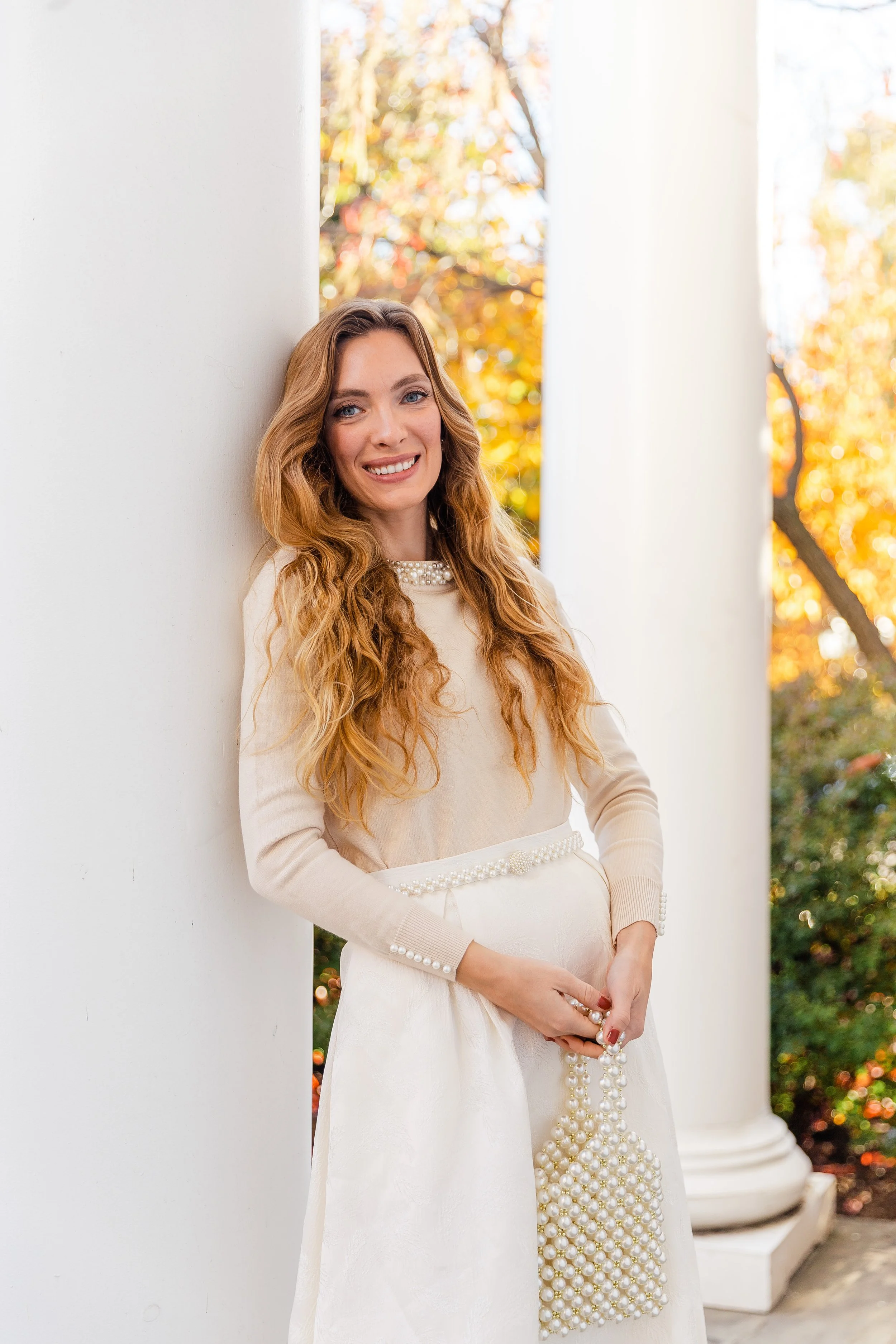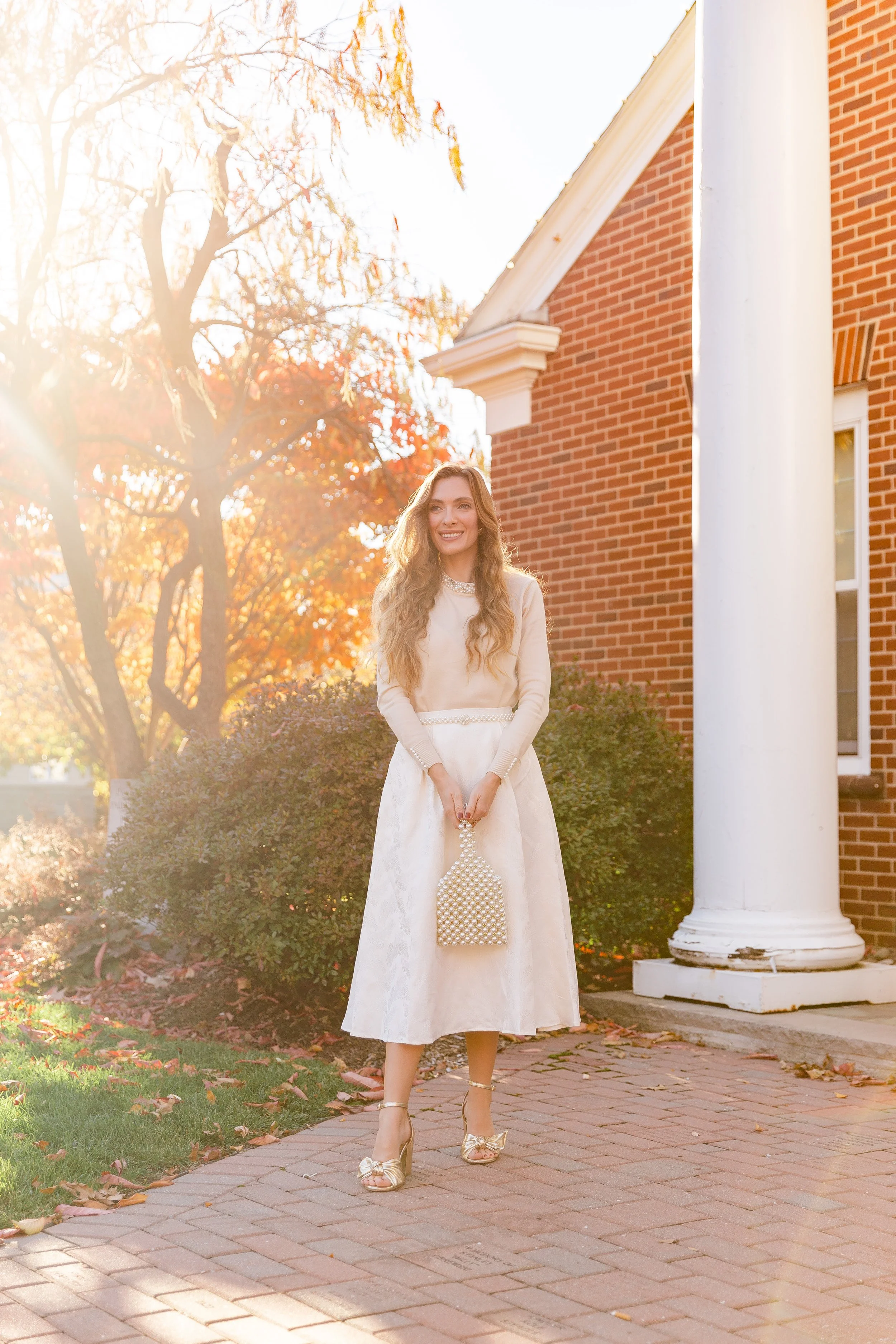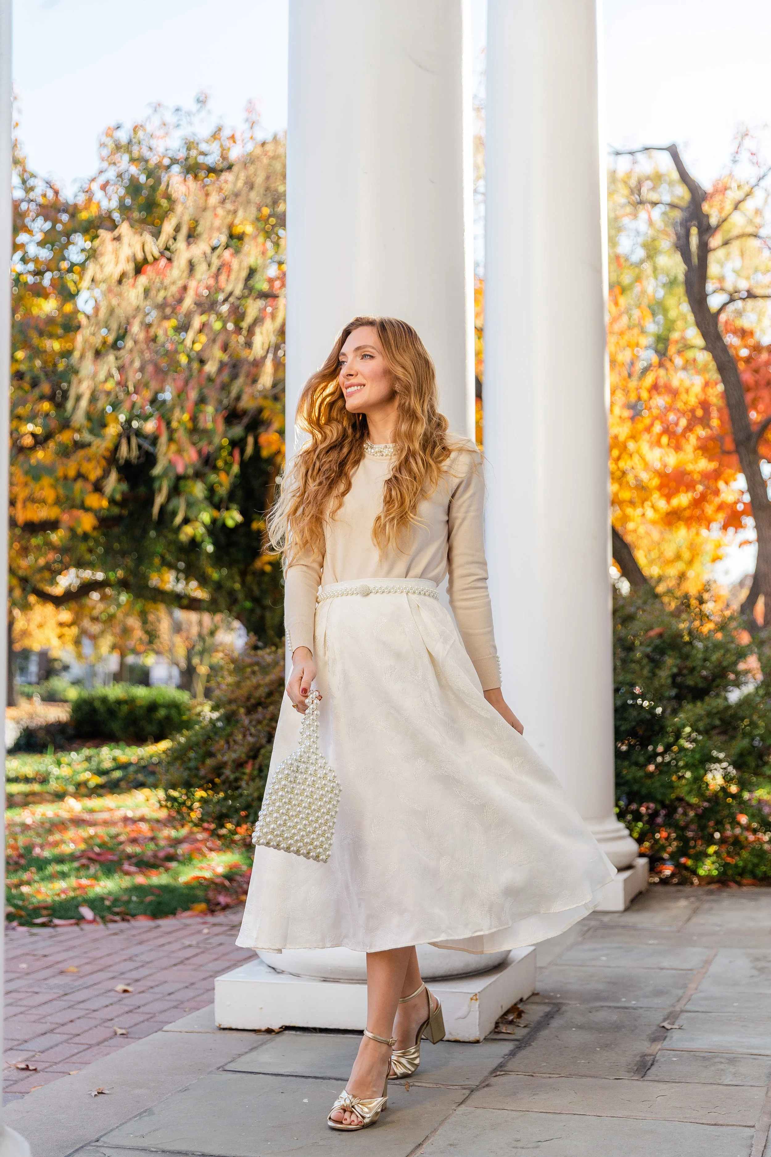 Welcome to November, friends! Today’s look is all about charming ladylike details in the most gorgeous creamy neutrals that are just perfect for the holiday season. This whole ensemble makes my heart swoon with happiness. As you know, I’m a vintage fan at heart and I adore anything that adds that little bit of glamour and polish to outfits. This creamy sweater from Chicwish feels so soft and warm and also has the most beautiful pearl trimmed collar with pearl trimmings also at the cuffs. Wearing this sweater with a pair of jeans and over the knee boots would be a fun way to add some polished flair to an everyday look! I choose to pair the embellished sweater with a jacquard reed print skirt for a more romantic feel. The skirt, also from Chicwish, comes in a gorgeous shade of ivory, has a stretchy pearl belt and pockets! Side note, I’m in love with the pearl belt! How fantastic to be able to wear it with other outfits. A true winner if I do say so myself. Both pieces, worn together or separate, create a timeless ensemble with lovely details.