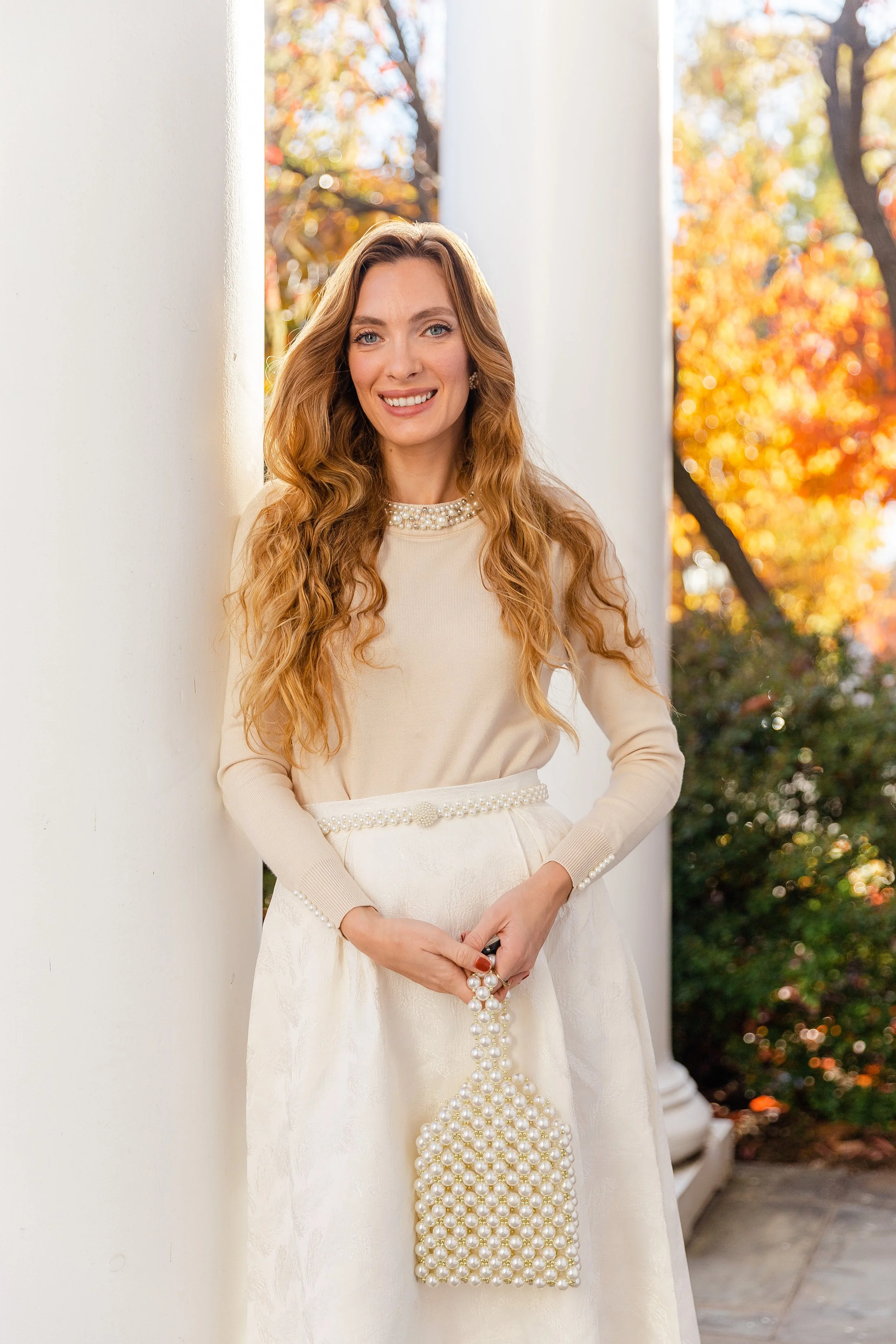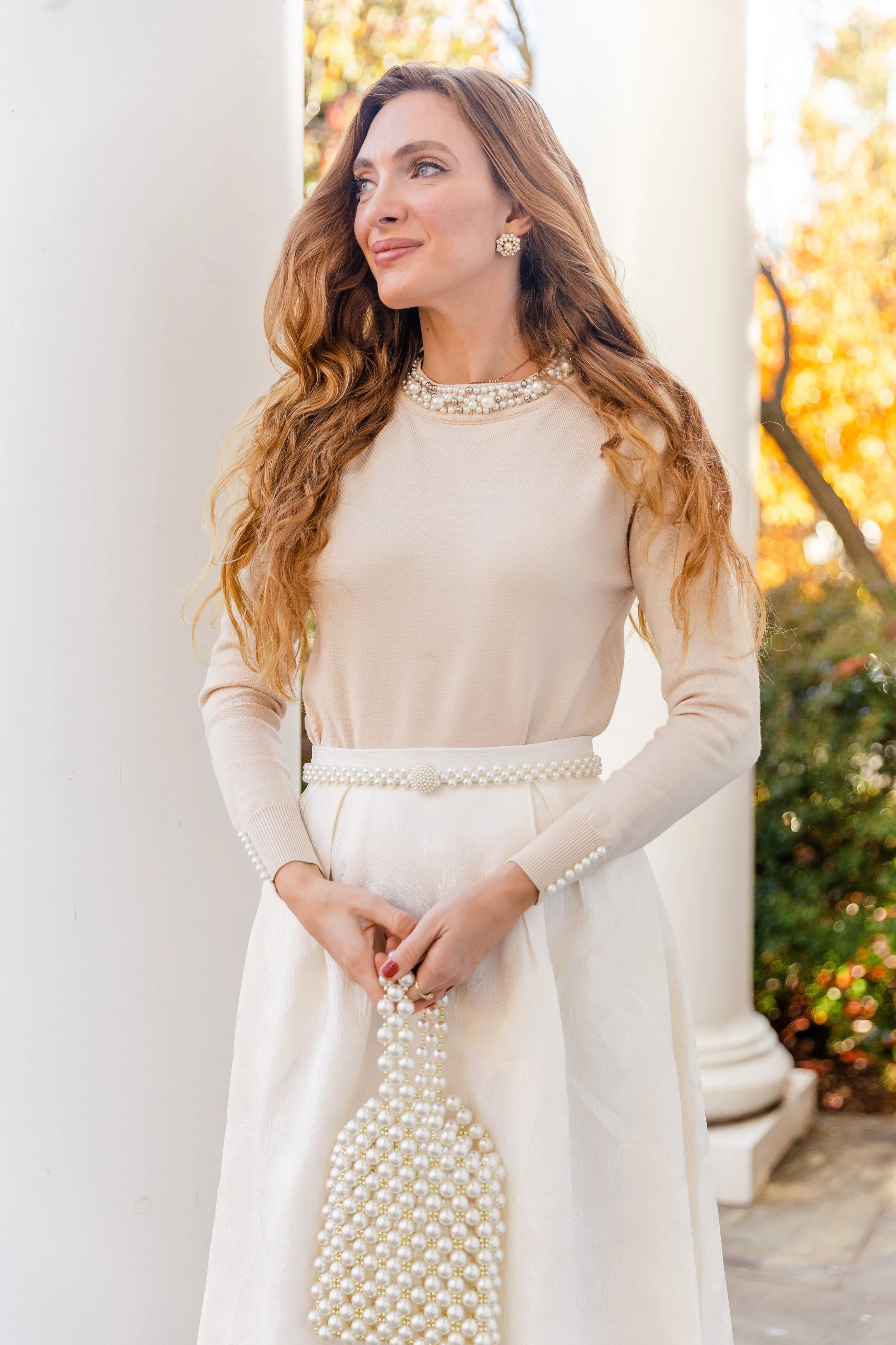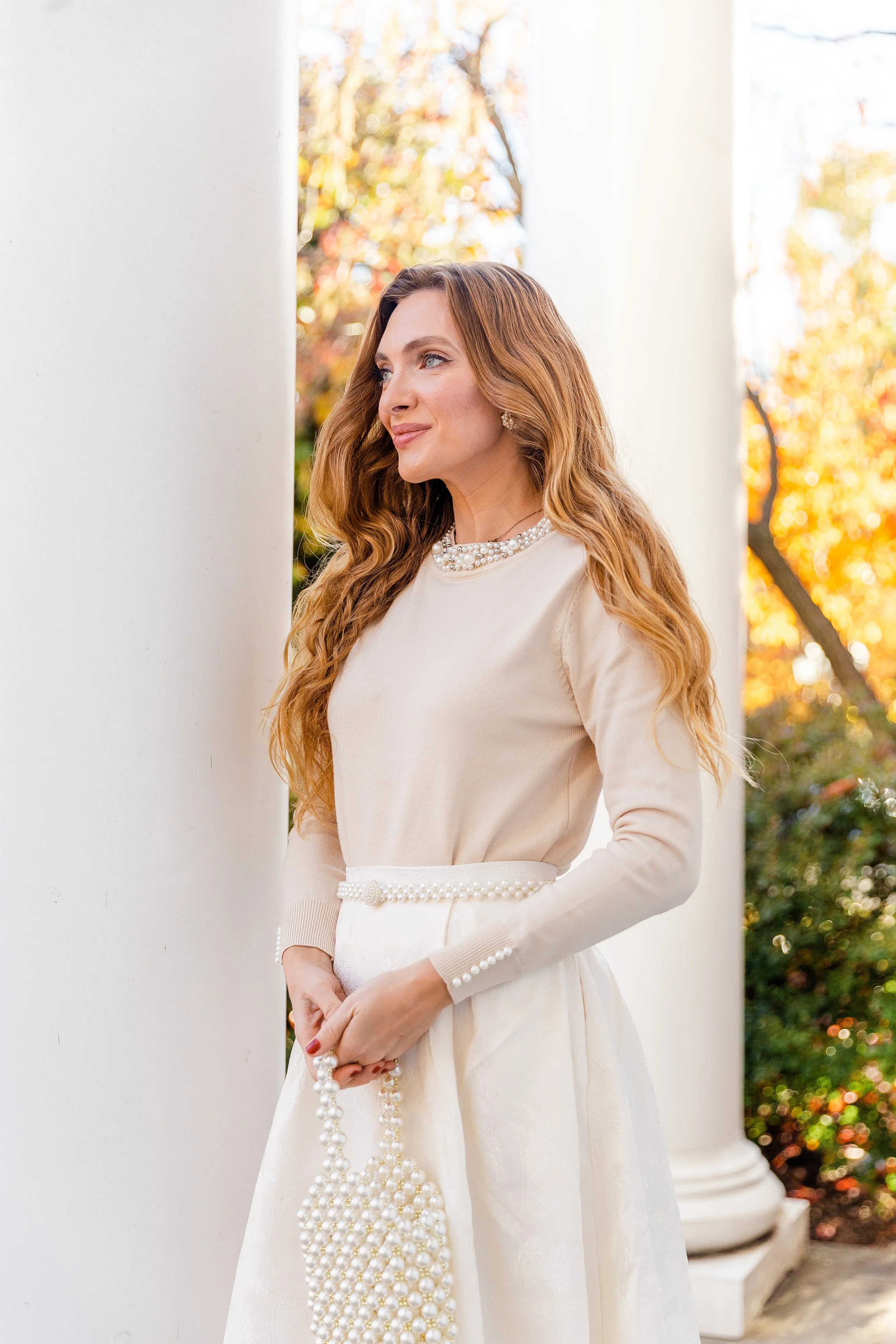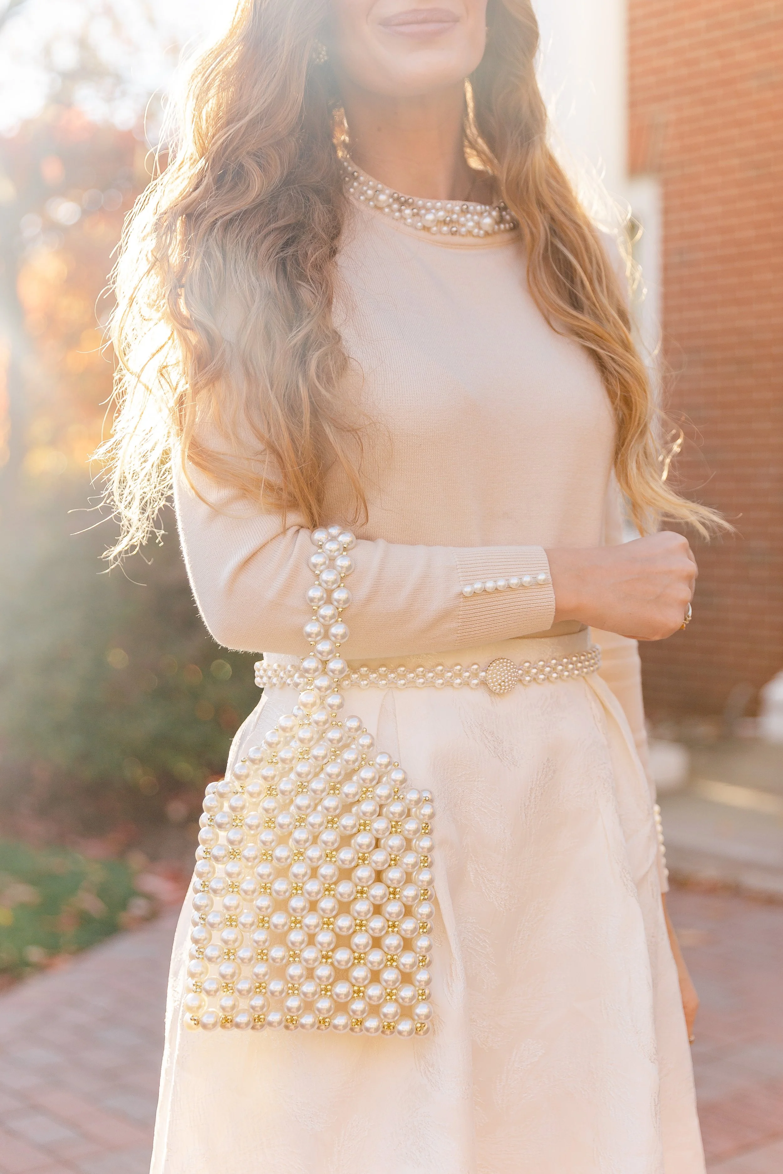 Pearl Trimmed Sweater c/o || Jacquard Pearl Belt Skirt c/o || Gold Knotted Heels || Pearl Bag (Old, Similar) || Nail Color In Lipstick Stain || Earrings (Vintage From My Mom) || Gold Name Necklace ||