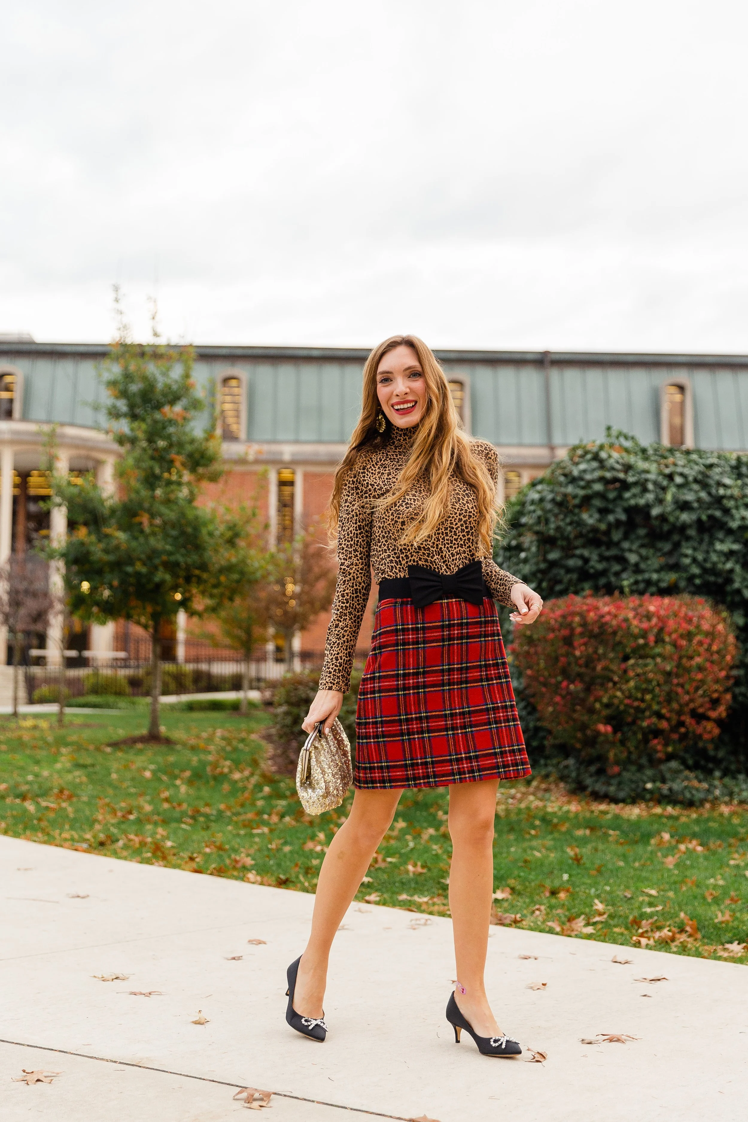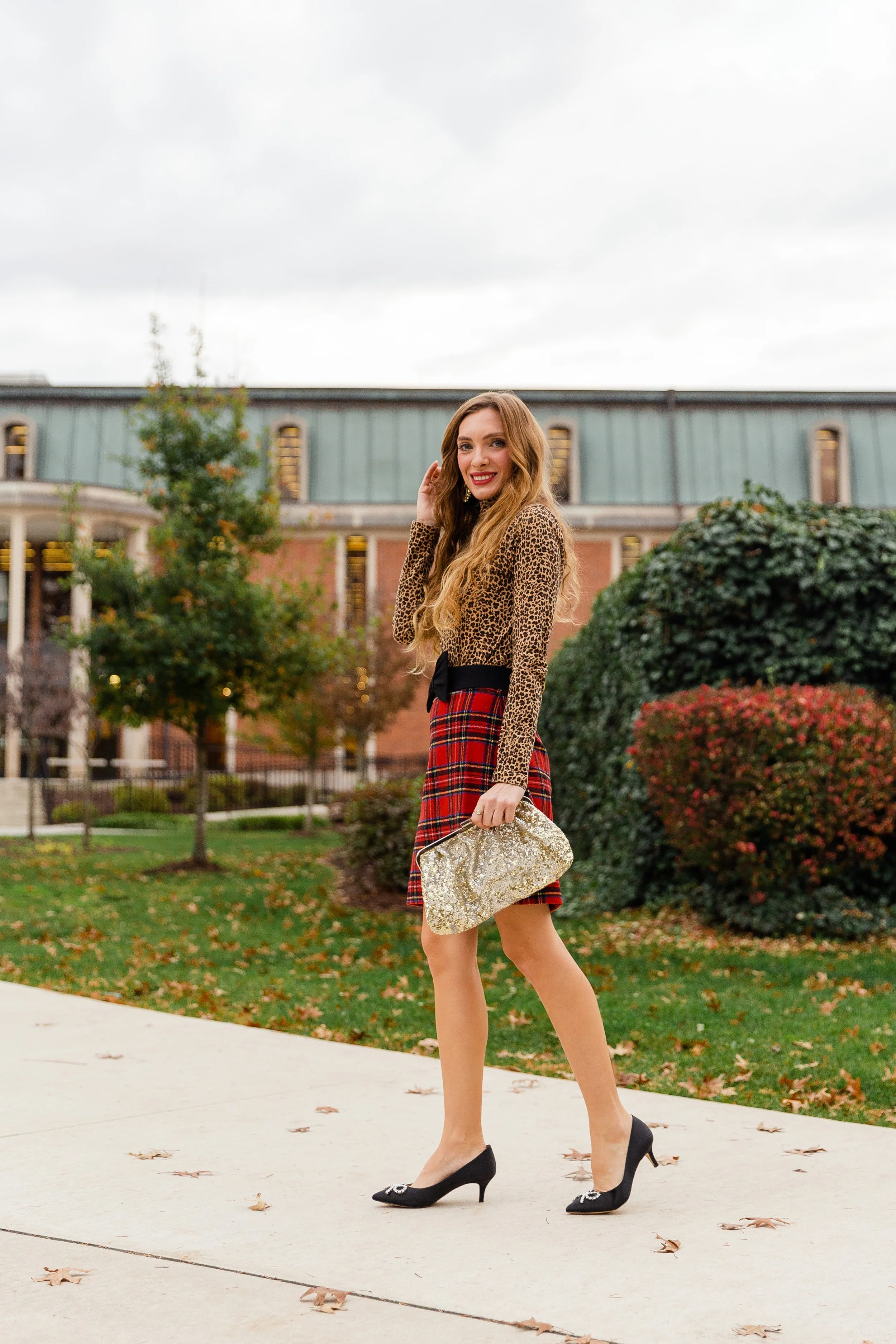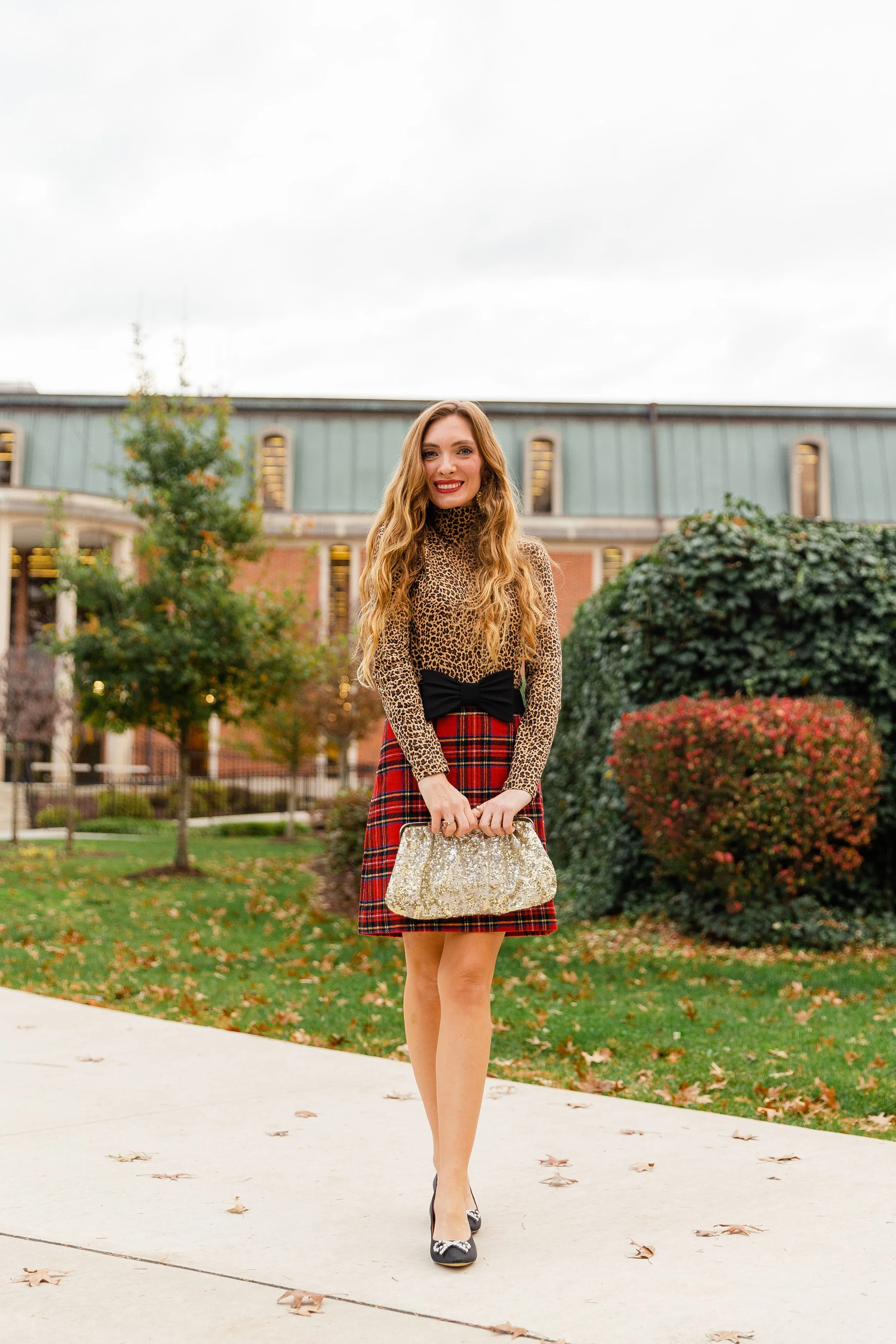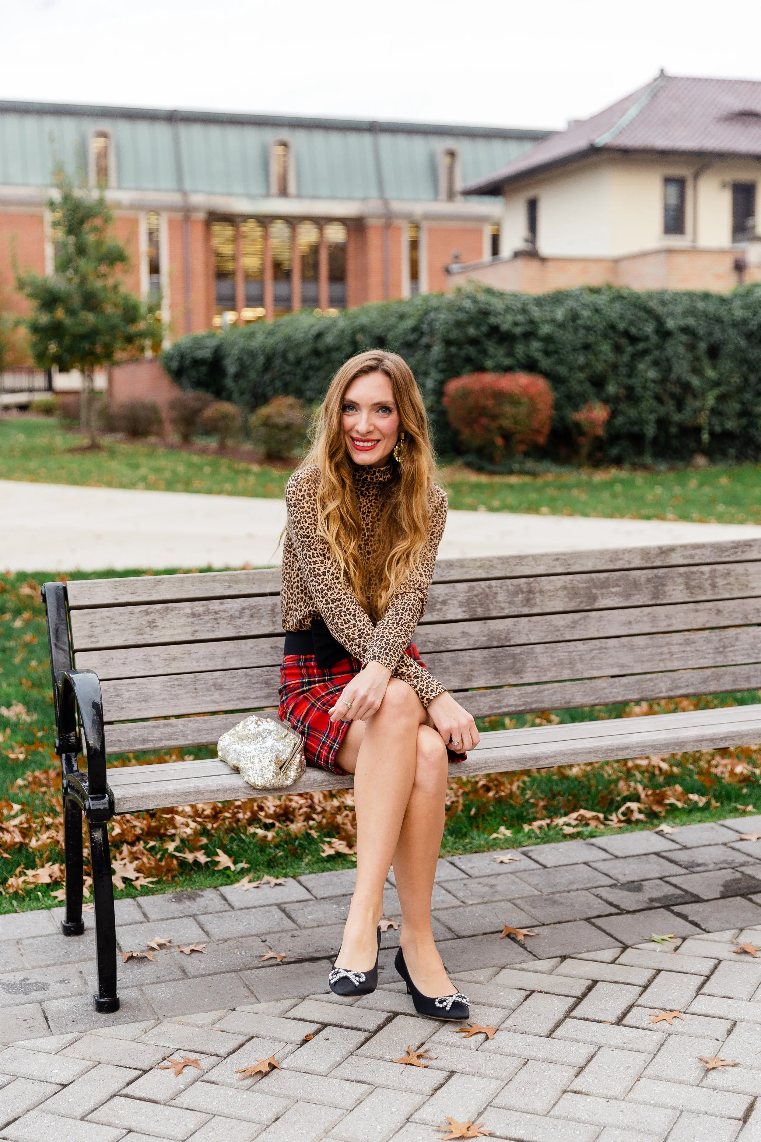 Happy Monday, friends and welcome to the new week! One of the most festive prints for the holidays is plaid and one of my favorite prints to mix it with is leopard. It creates an eye catching ensemble that feels fun and chic at the same time. As you know, I typically use leopard almost like a neutral, as it pairs so well with many different colors and patterns alike. The leopard turtleneck top is fantastic for layering underneath sweaters or worn on its own. It’s very lightweight making it an ideal layering piece. The plaid skirt is a timeless classic that can be worn all autumn and winter long. I especially love pops of red with a snowy backdrop. I’m absolutely head over heels for these crystal bow kitten heels too! Embellishments and some sparkle always add that special touch to any look. Life is too short not to sparkle!