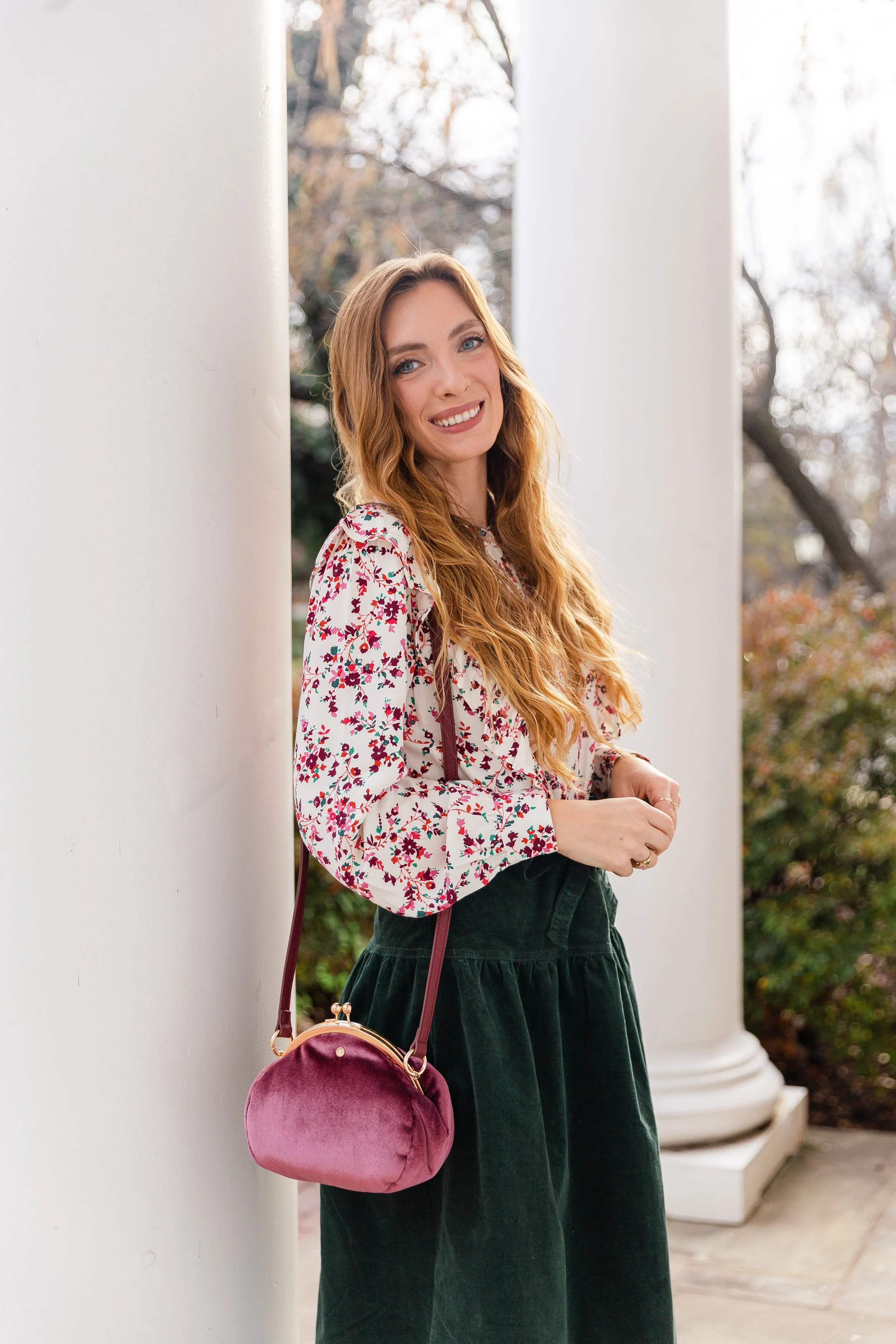 Corduroy always adds beautiful texture to outfits, especially during the autumn and winter seasons. This green corduroy midi skirt has the most darling bow at the waist and mixes so well with the fun flirty floral ruffle top. The floral print has the most beautiful shades of green, pink, burgundy, and red. A gorgeous reminder of spring during the winter months. Let’s not forget the vintage style velvet bag too! I love the casual elegance this outfit has for the holidays and winter, but also love pairing this floral top with a pair of light wash jeans and some Chanel style kitten heels. Equally causal and just as chic.