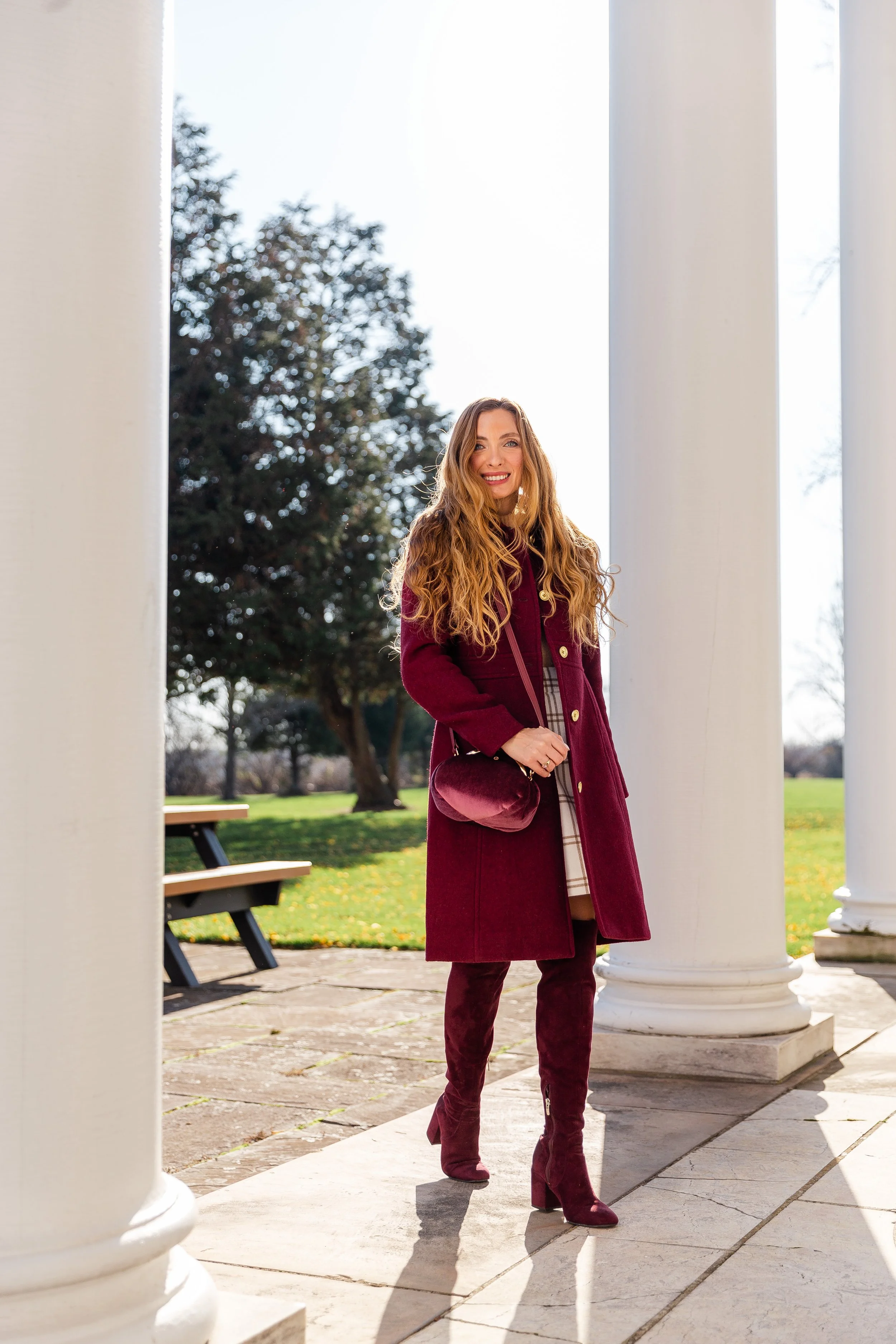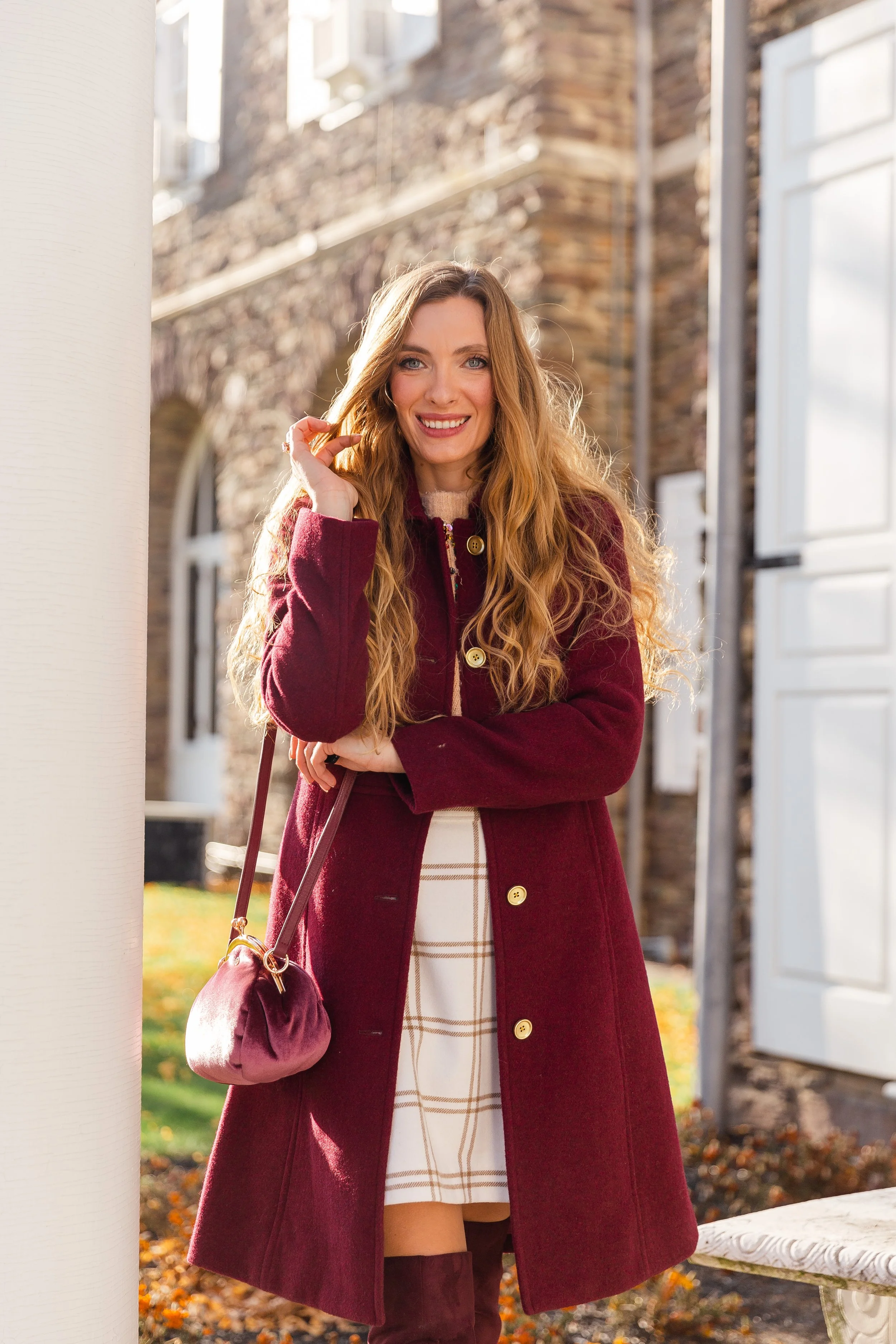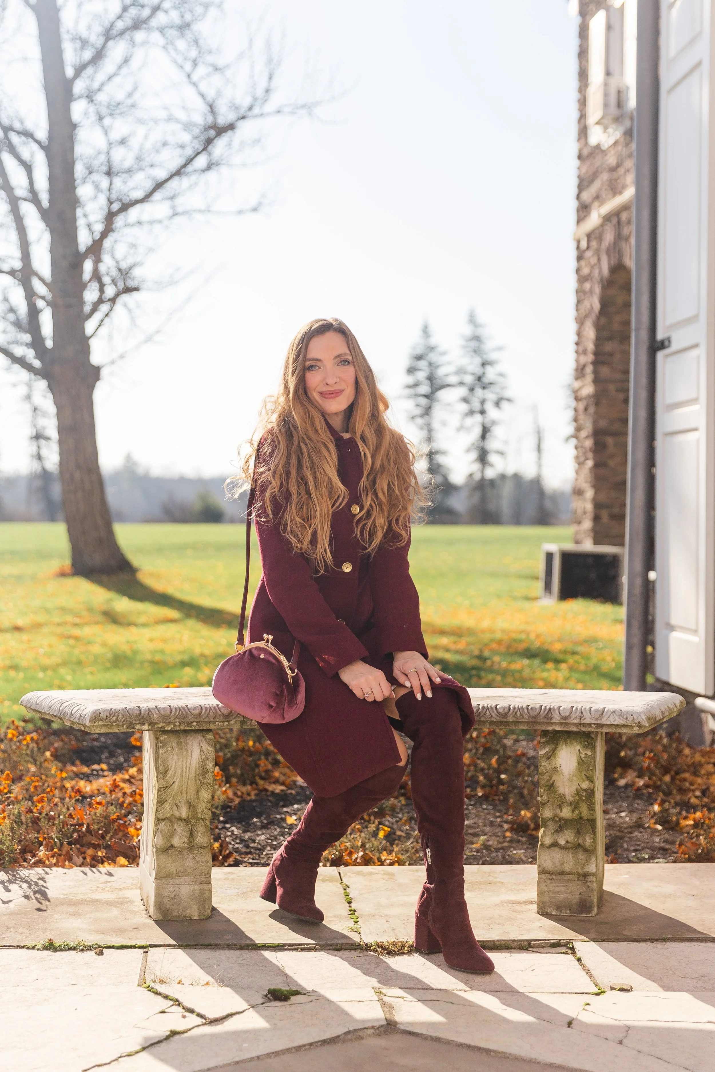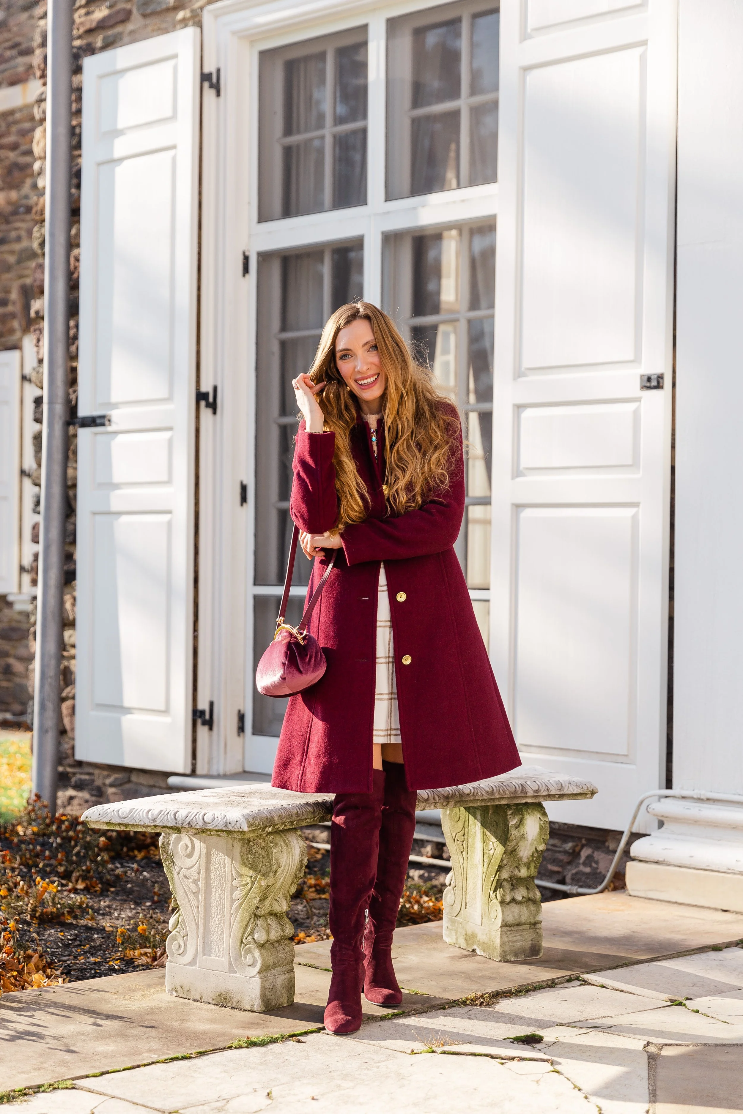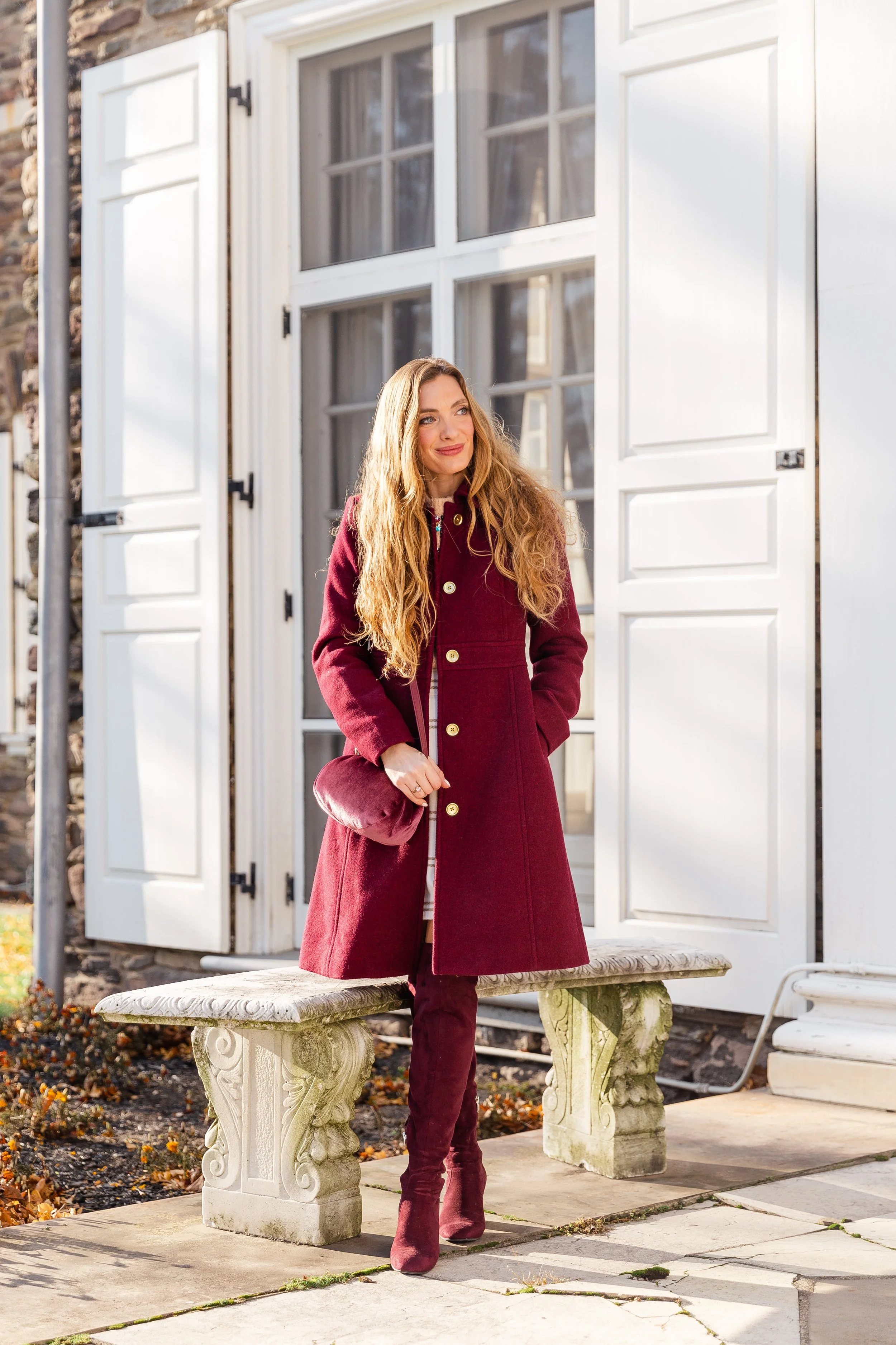 Happy Friday, friends! It’s official that my favorite color, besides pink, for the fall and winter season is burgundy. I gravitate towards the rich color every single year and swoon each time I see dazzling items in the deep reddish-brown shade. This ladylike wool blend coat, in a warm burgundy hue, fits like a glove and is made in a thick heavy material to keep you nice and toasty all season long. The gold buttons add that extra bit of shine and the length hits at about the knees. For the best fit, I would recommend sizing up one size.