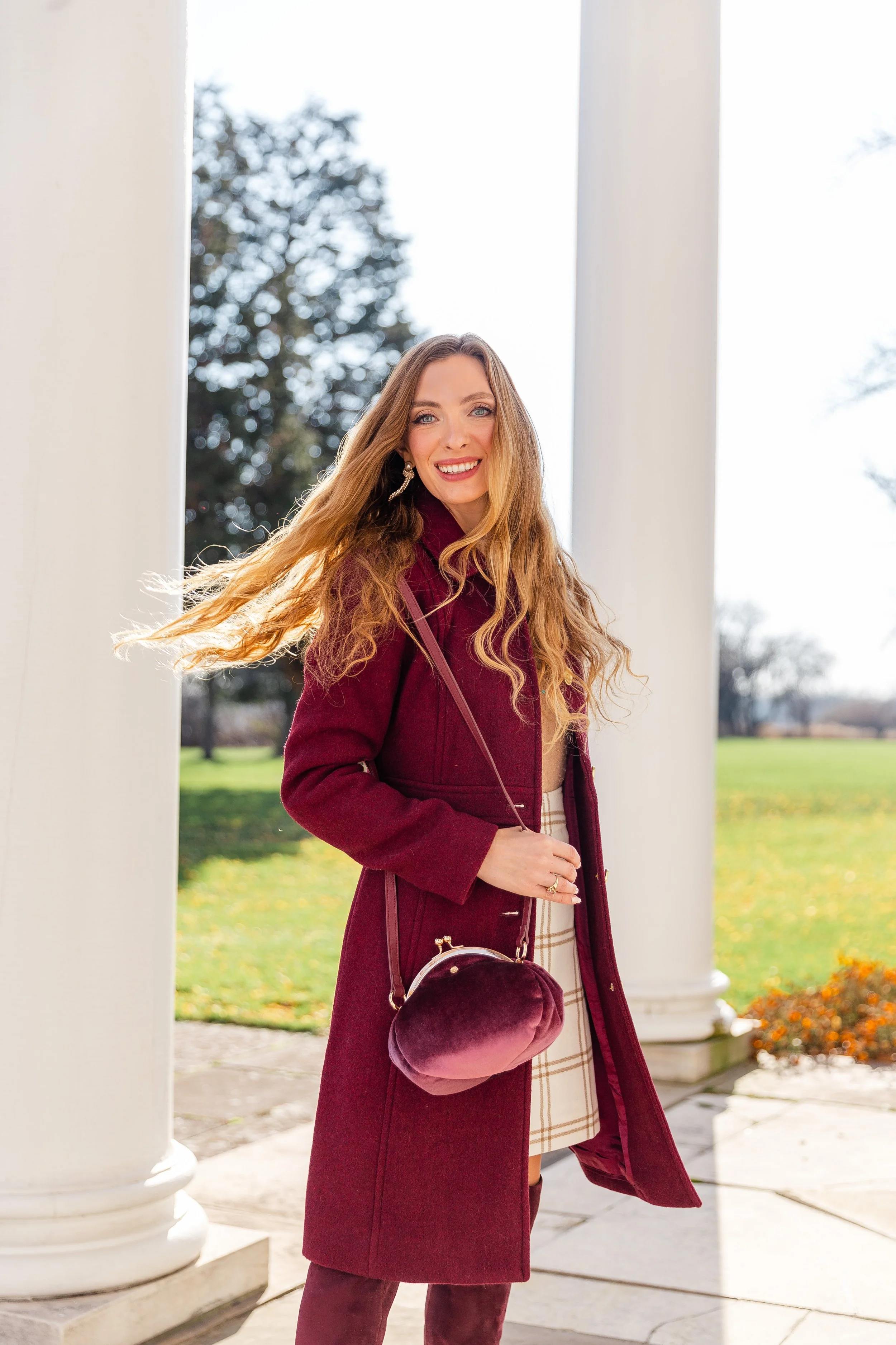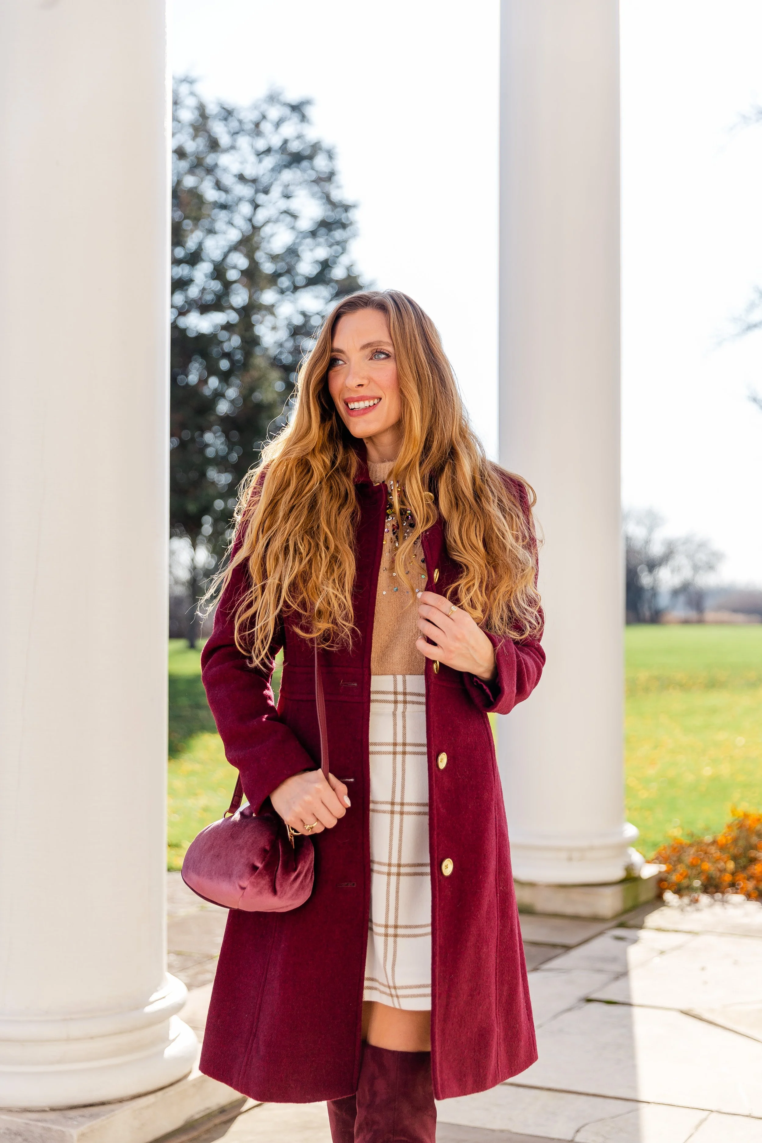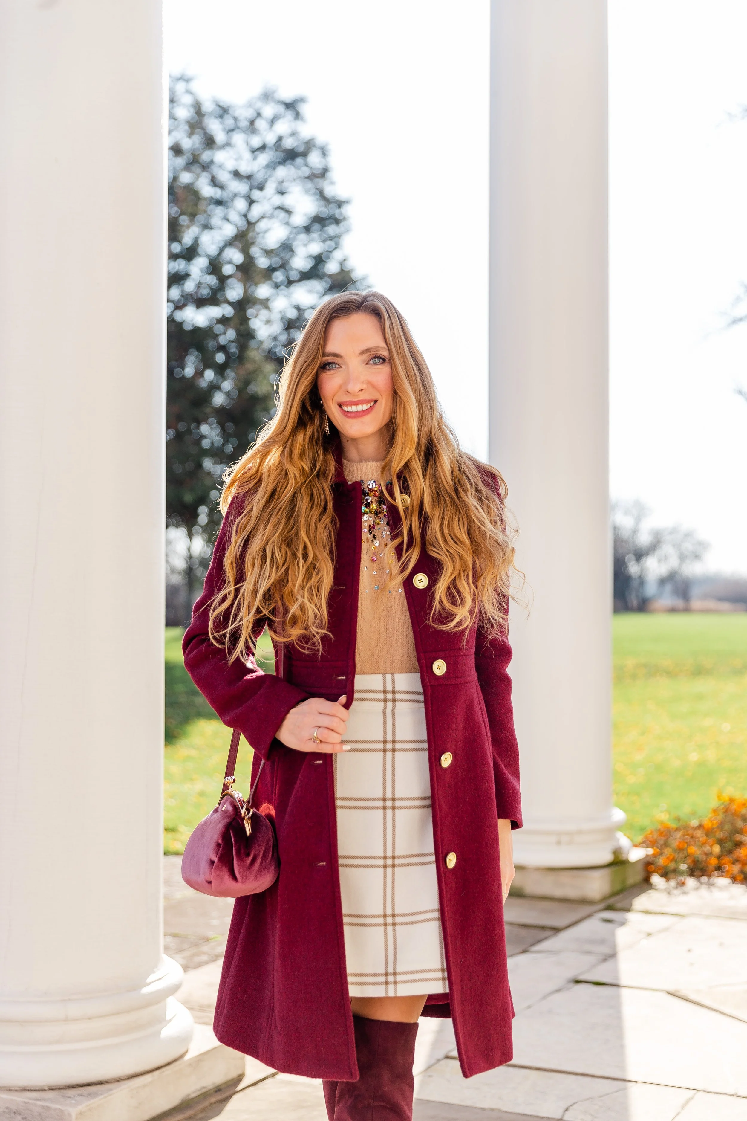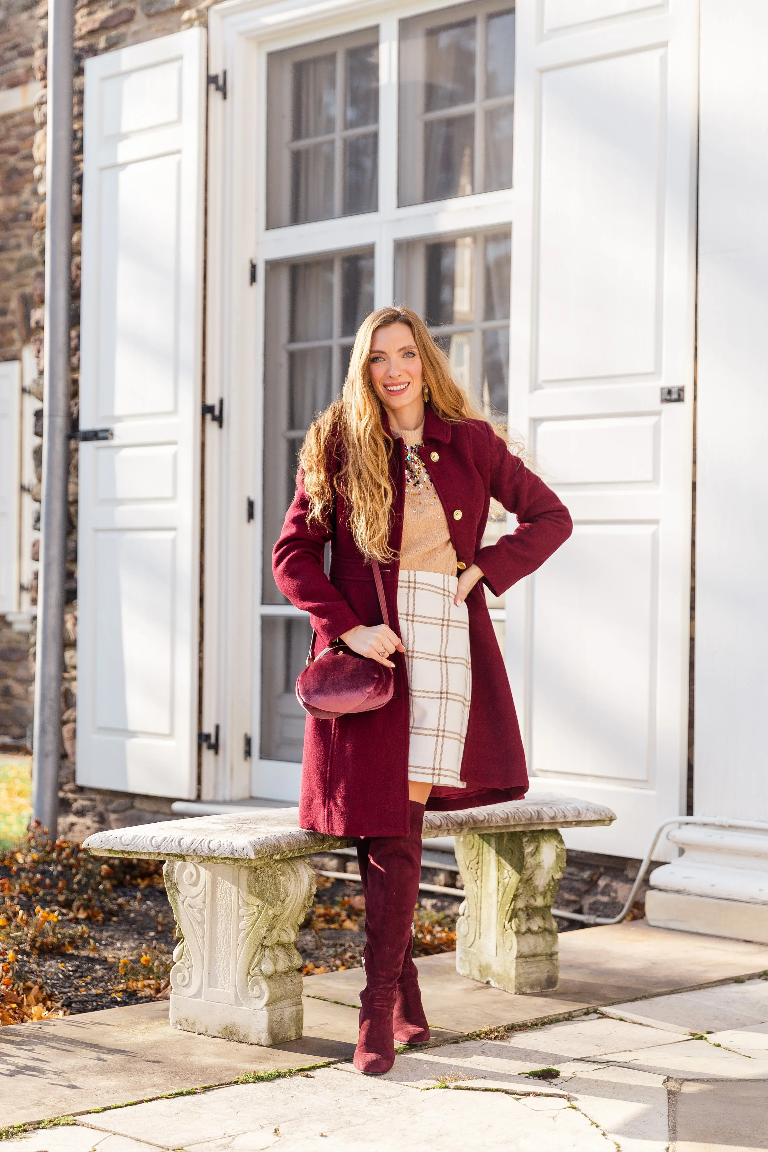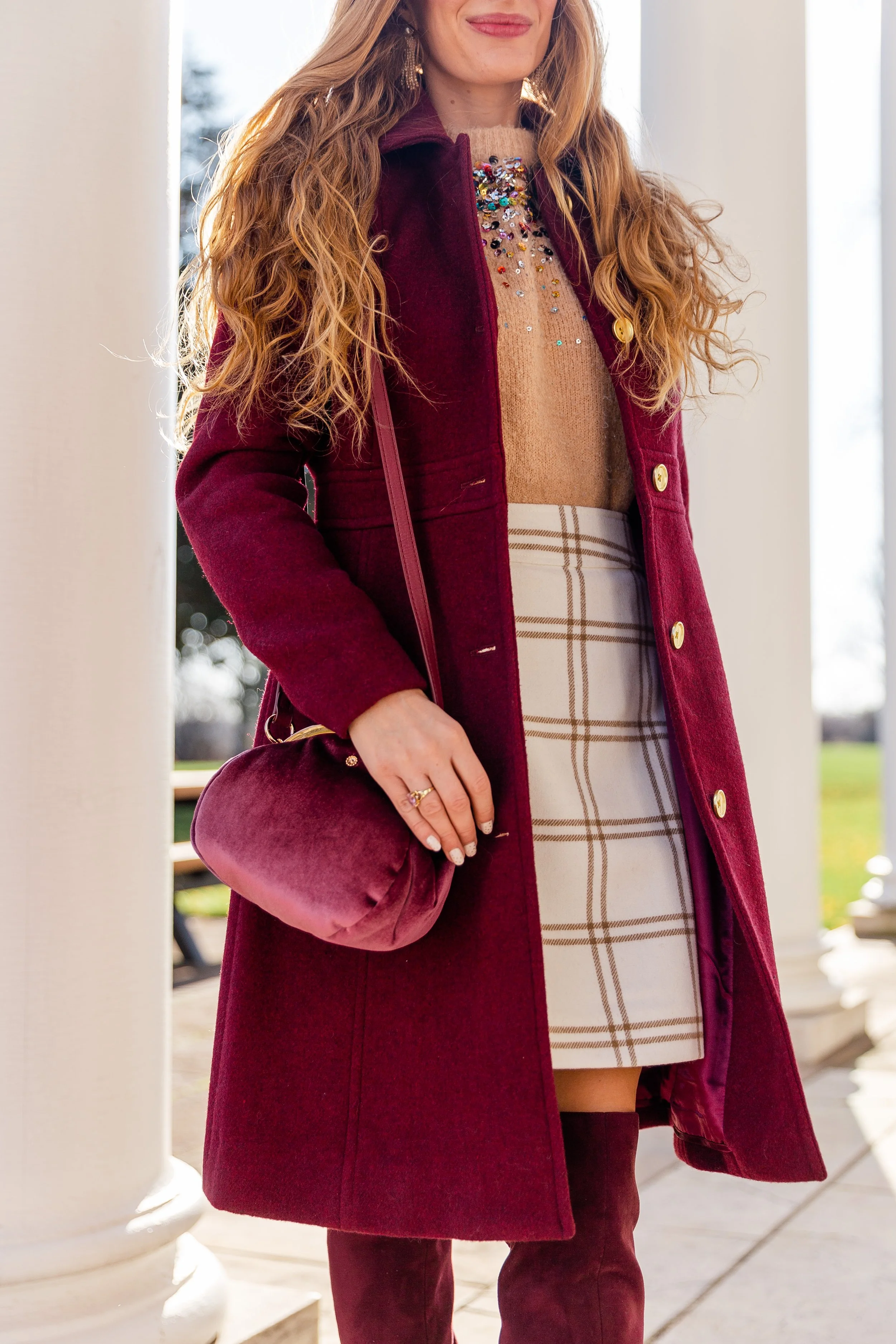 Wool Blend Burgundy Coat || Sequin Sweater (Old) || Plaid Skirt (Sold Out, Other Colors Available) || Burgundy Boots (Old, Similar) || Velvet Bag || Pearl & Crystal Drop Earrings || Metallic Confetti Nails || Gold Name Necklace ||