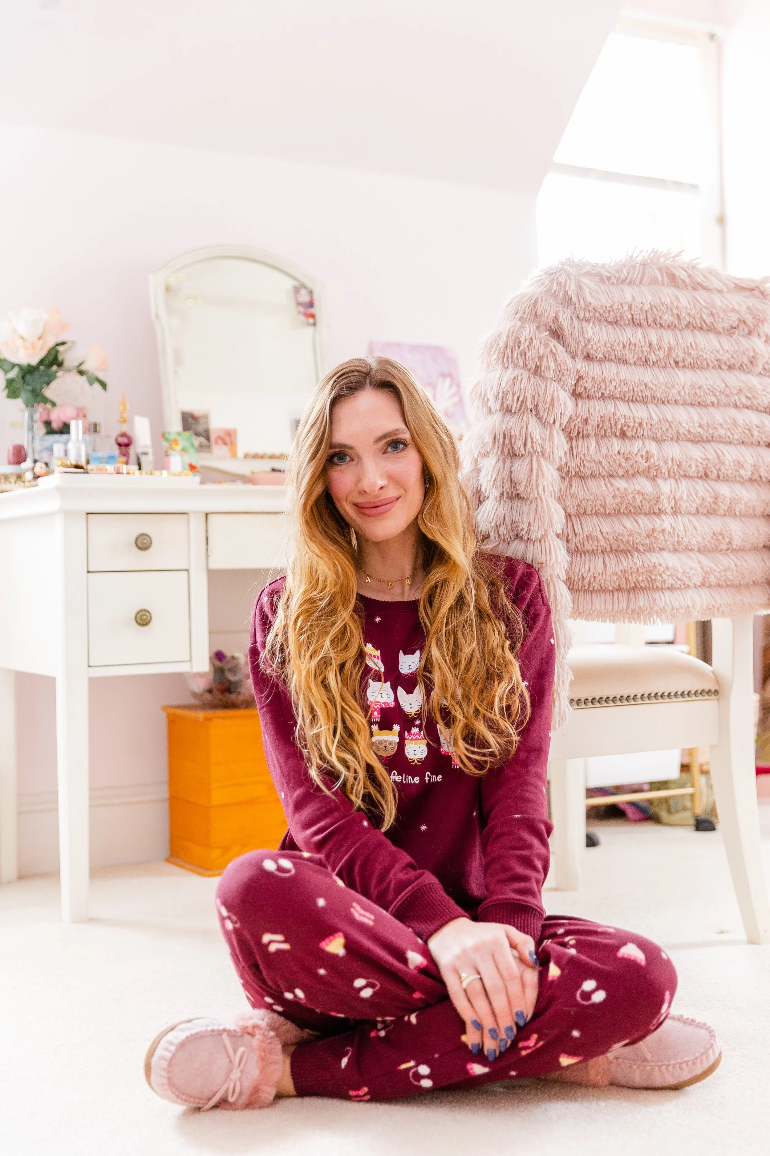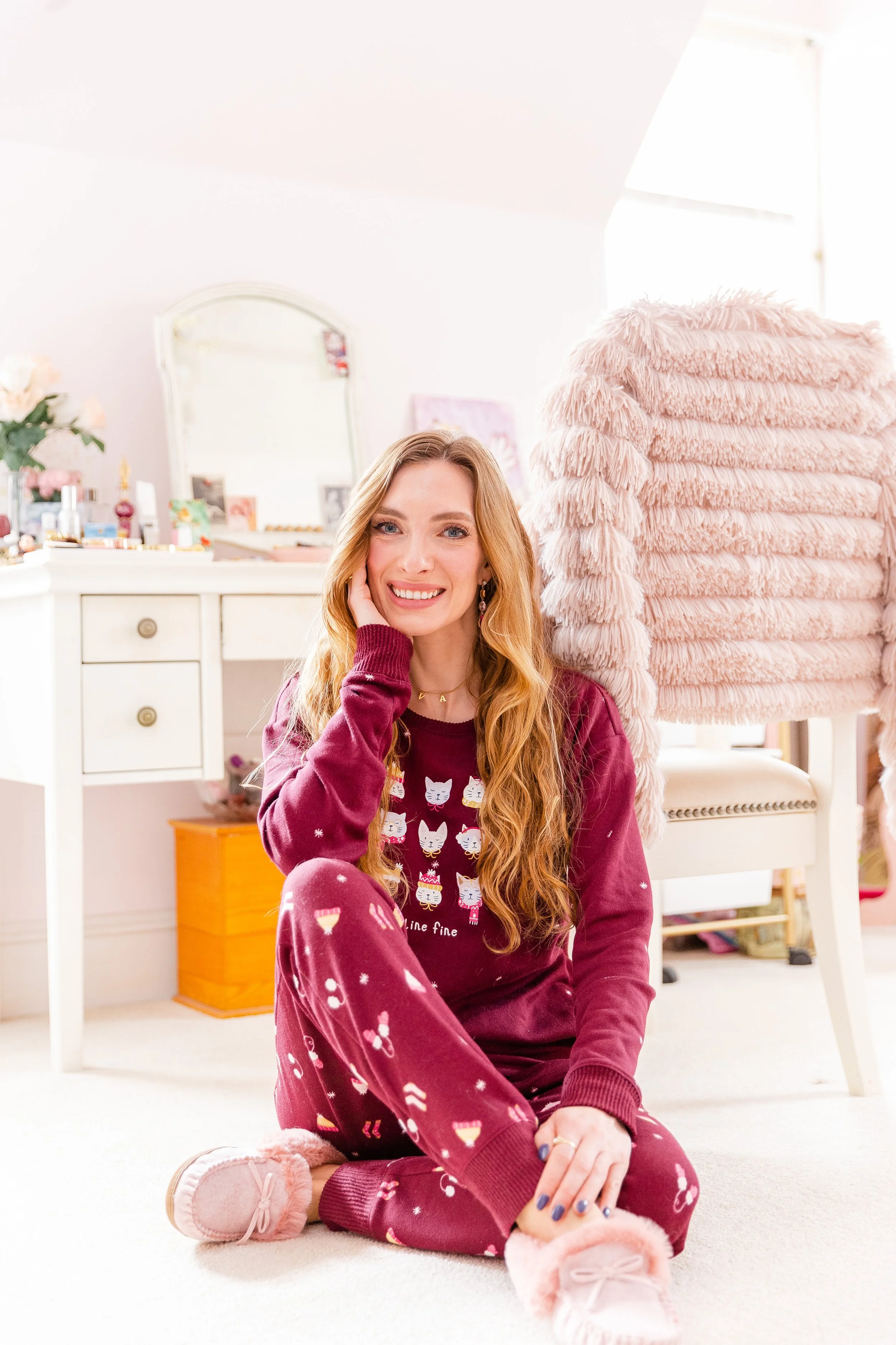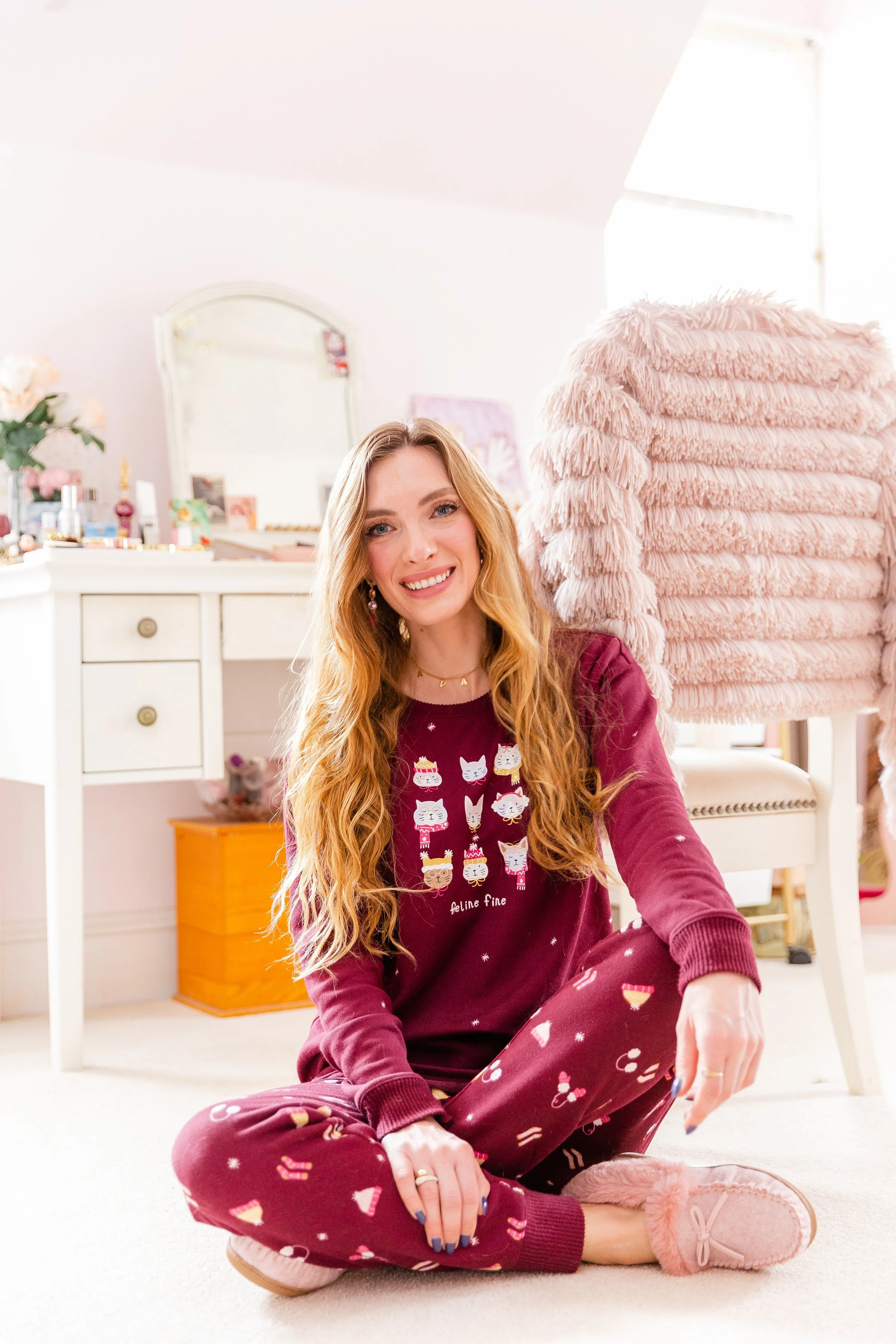 Cat Print Pjs || Pink Slippers || Crystal Ring || Gold Name Necklace ||