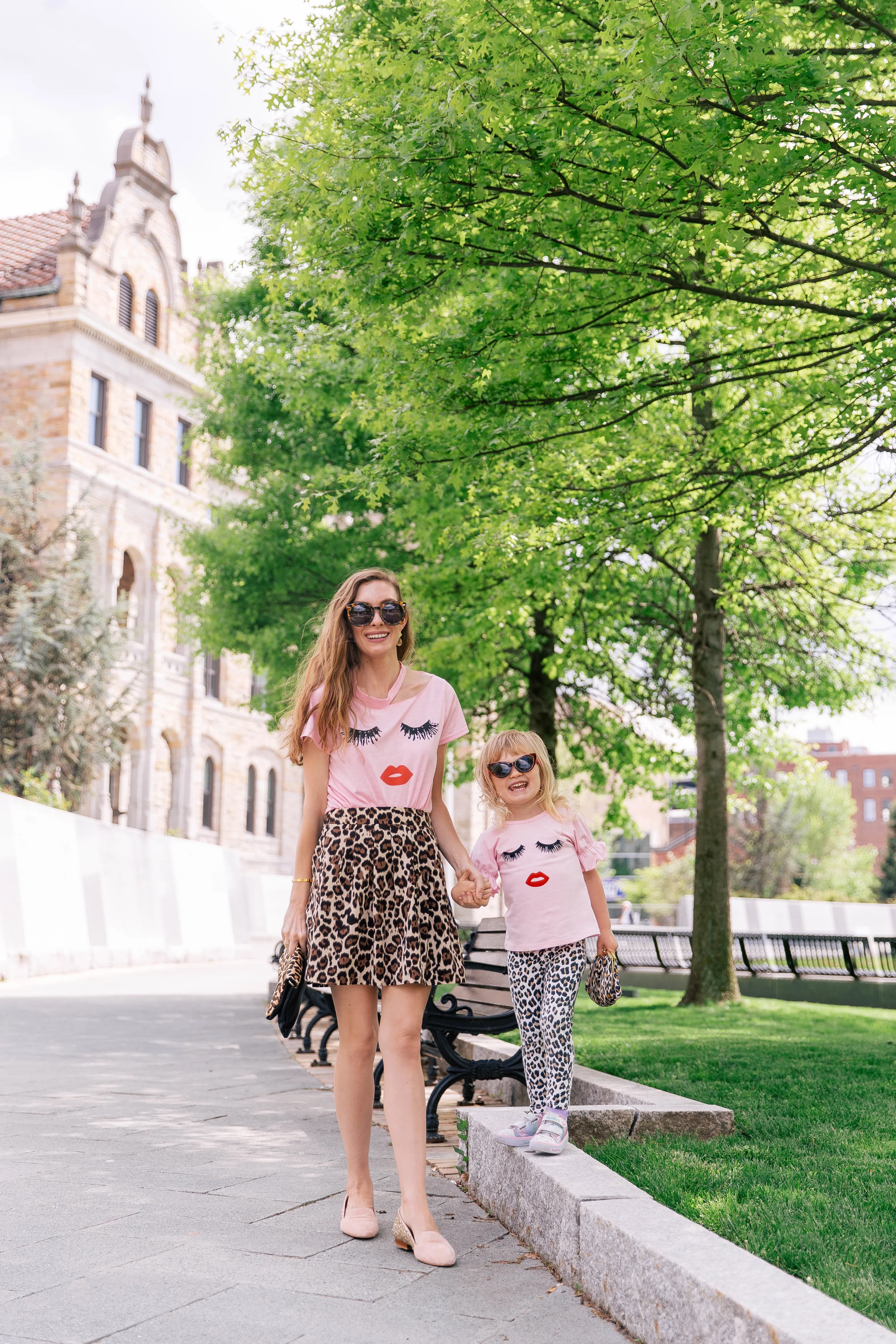 Kiss Face Top c/o || Ava’s Kiss Face Top c/o || Similar Leopard Skirt || Karen Walker Sunglasses || Similar Leopard Clutch || Pink & Gold Glitter Loafers || Pink & Blue Co. Bracelet c/o || Leopard Earrings c/o ||