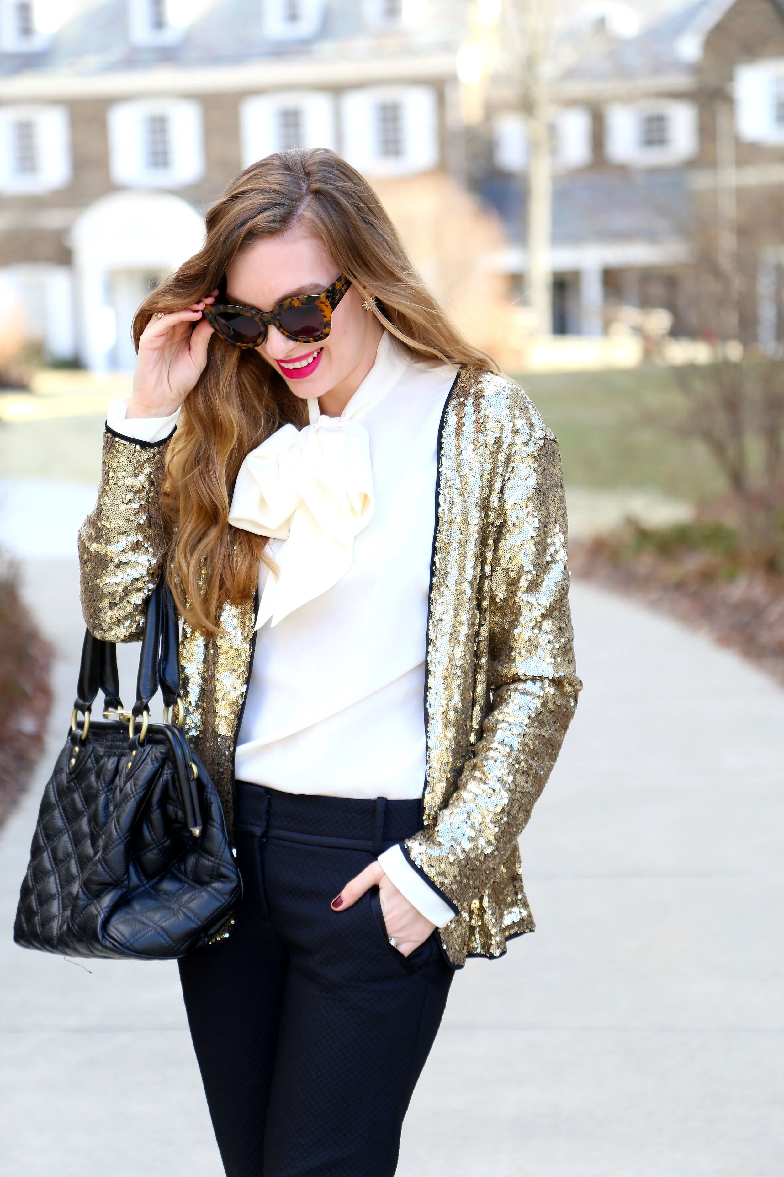 Shein Sequin Jacket c/o || Bow Blouse || Straight Leg Pants || Similar Quilted Bag || Similar Heelsalso, less expensive version Here || Karen Walker Sunnies via Shop Ditto || Jackie Kennedy Unity Band || Lip Color in Obsession ||